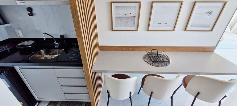- COZINHA: sanduicheira, cafeteira elétrica, frigobar, garrafa térmica, liquidificador, airfryer, fogão duas bocas de indução, depurador de ar e acessórios de cozinha variados