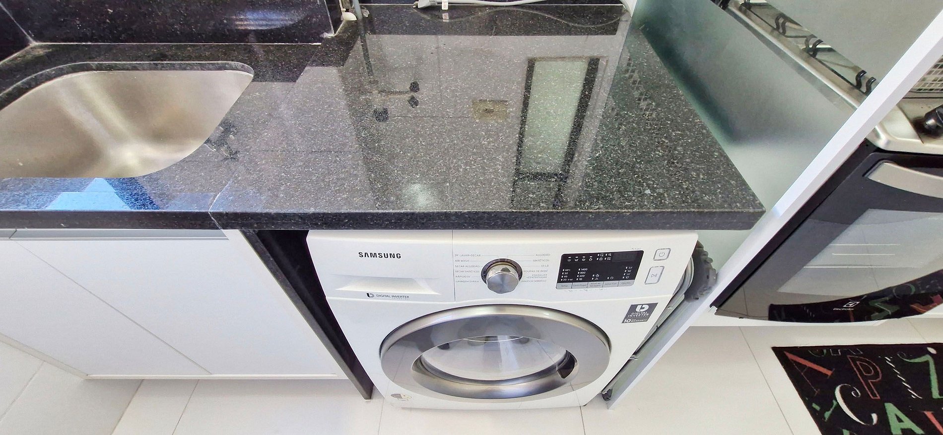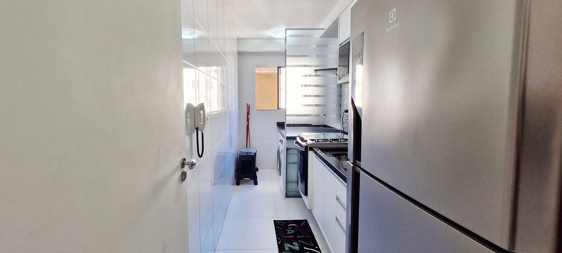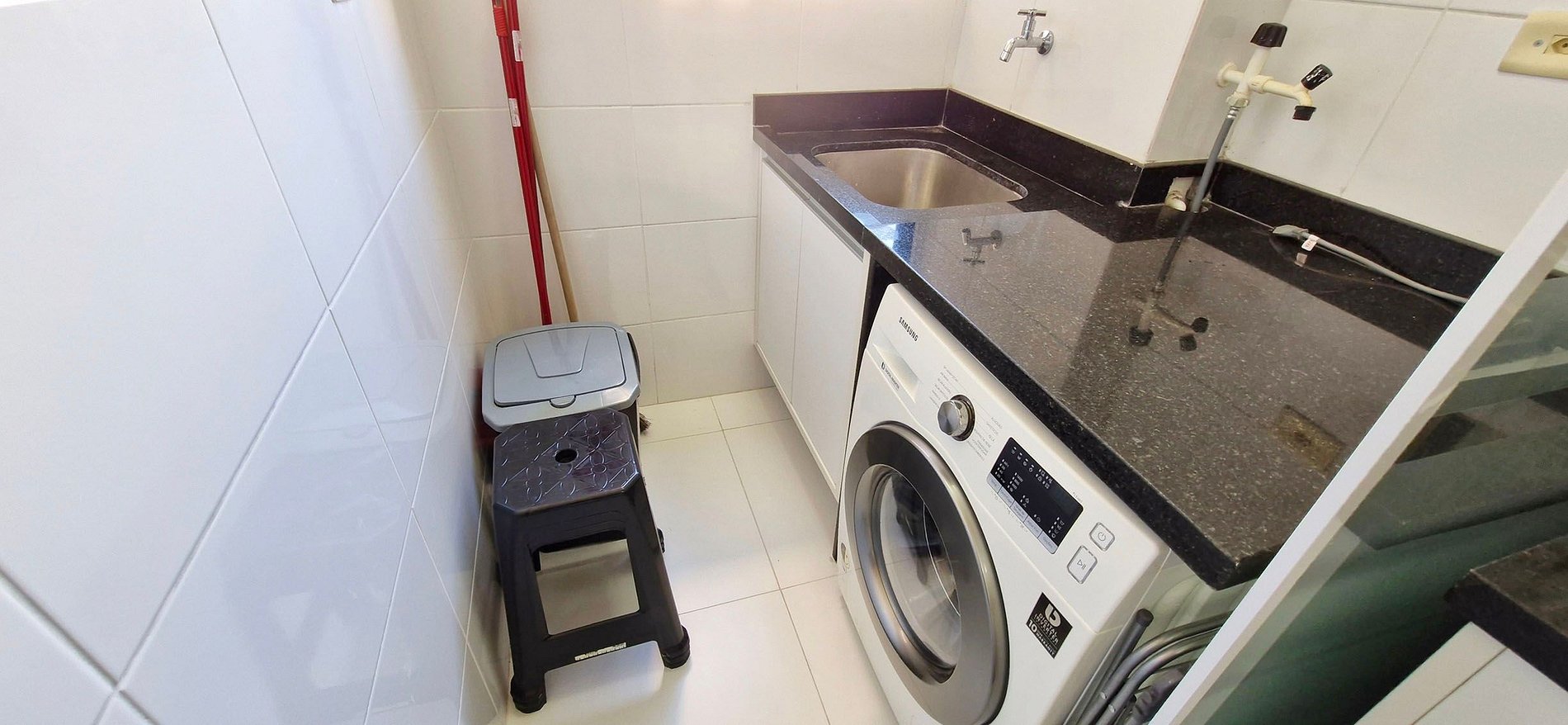 - Área de serviço com pia, máquina lava e seca, banco de plástico, varal de chão, balde, vassoura, rodo e pá