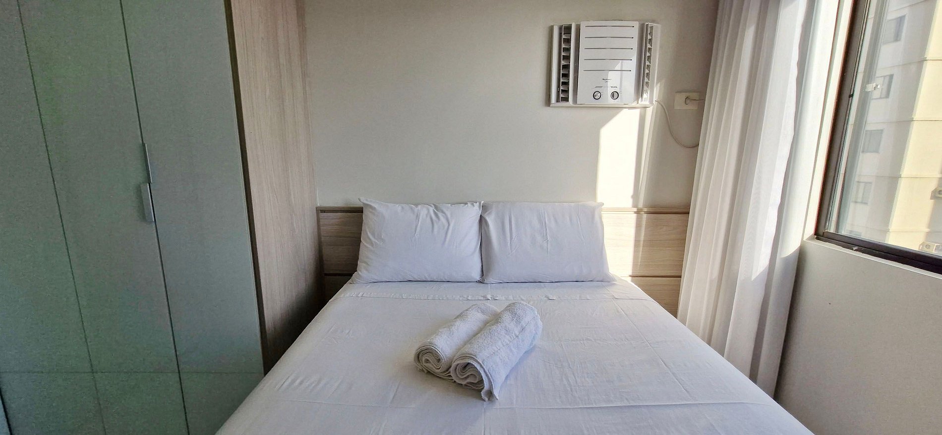 - Quarto com 2 camas de solteiro, ventilador de pé, cortina blackout, guarda-roupa, cabides, mesa de cabeceira