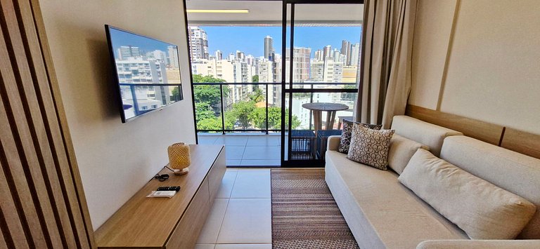 Ar condicionado split na sala e no quarto. Suíte com cama casal padrão, varanda grande, sala com sofá-cama casal, smart TV, WI-FI, cozinha. Prédio com piscina e academia na cobertura. Tem garagem rotativa, lavanderia (você paga diretamente ao app) e recepção 24hs.