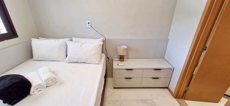 - SUÍTE: cama casal, guarda-roupa, ar condicionado split, janela com cortina blackout, abajur. BANHEIRO com armário, espelho, box, ducha higiênica e chuveiro elétrico.