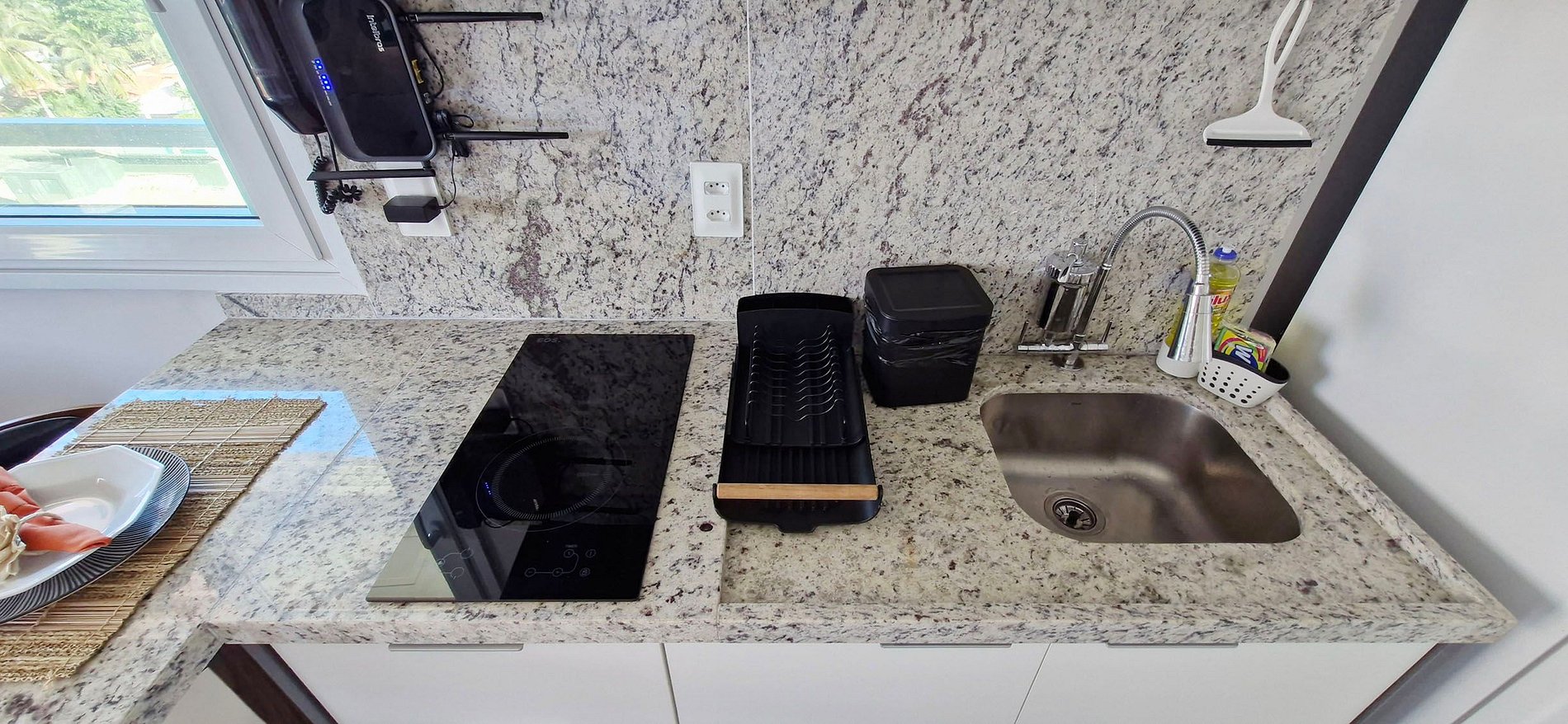- COZINHA: geladeira duplex, sanduicheira, cafeteira elétrica, garrafa térmica, liquidificador, microondas, cooktop duas bocas de indução, filtro de água, panelas, talheres, copos, taças e acessórios de cozinha variados.
