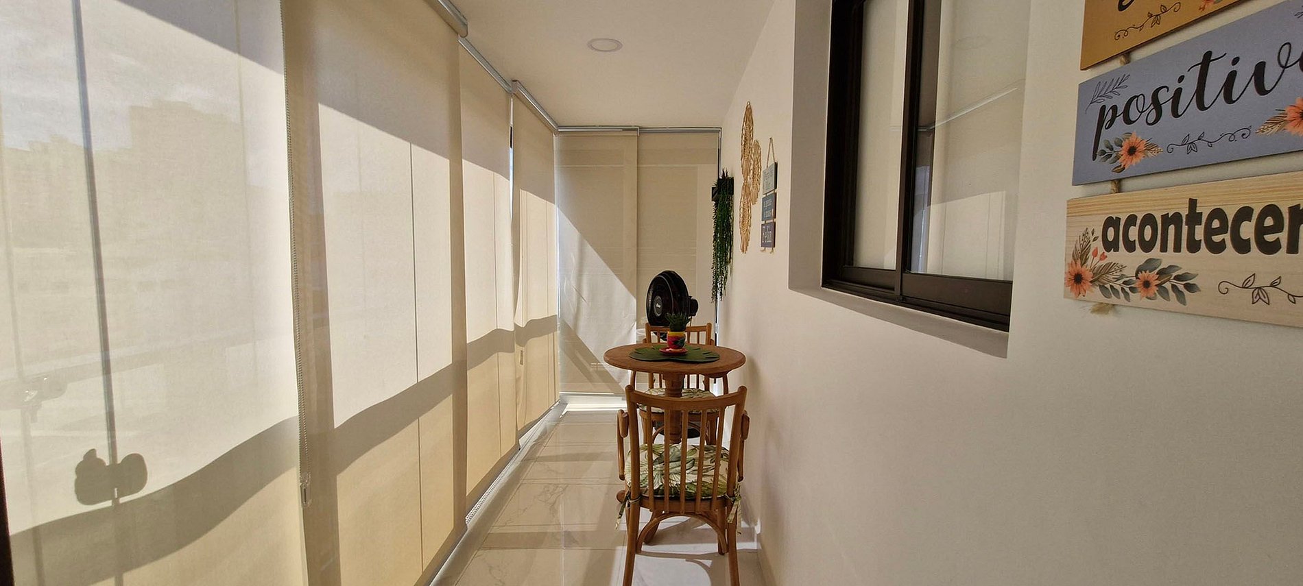 - VARANDA: janela Reikki com cortina persiana (NÃO É BLACKOUT), mesa redonda com 2 cadeiras, ventilador de pé