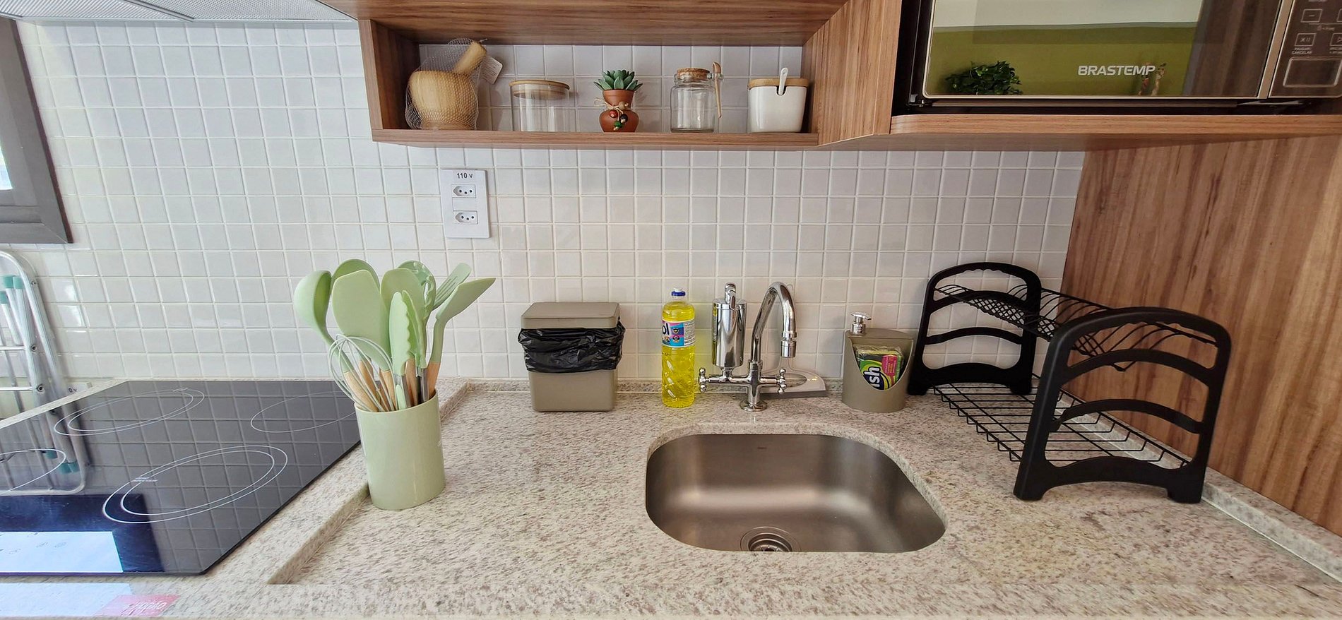 - COZINHA: geladeira duplex, fogão de indução de 4 bocas, depurador de ar, forno elétrico, filtro de água, sanduicheira, cafeteira elétrica, microondas, liquidificador, airfryer, copos, taças, panelas e acessórios de cozinha variados.
