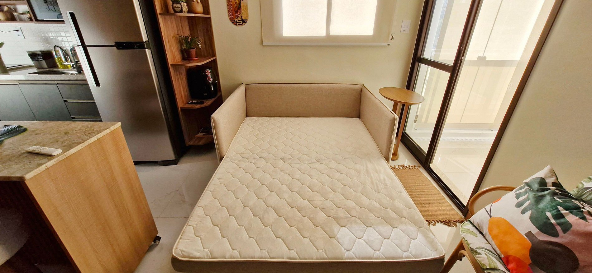 - SALA DE ESTAR: rack com smart TV (apps e canais locais), ventilador de teto, sofá-cama, cortina persiana (NÃO É BLACKOUT)