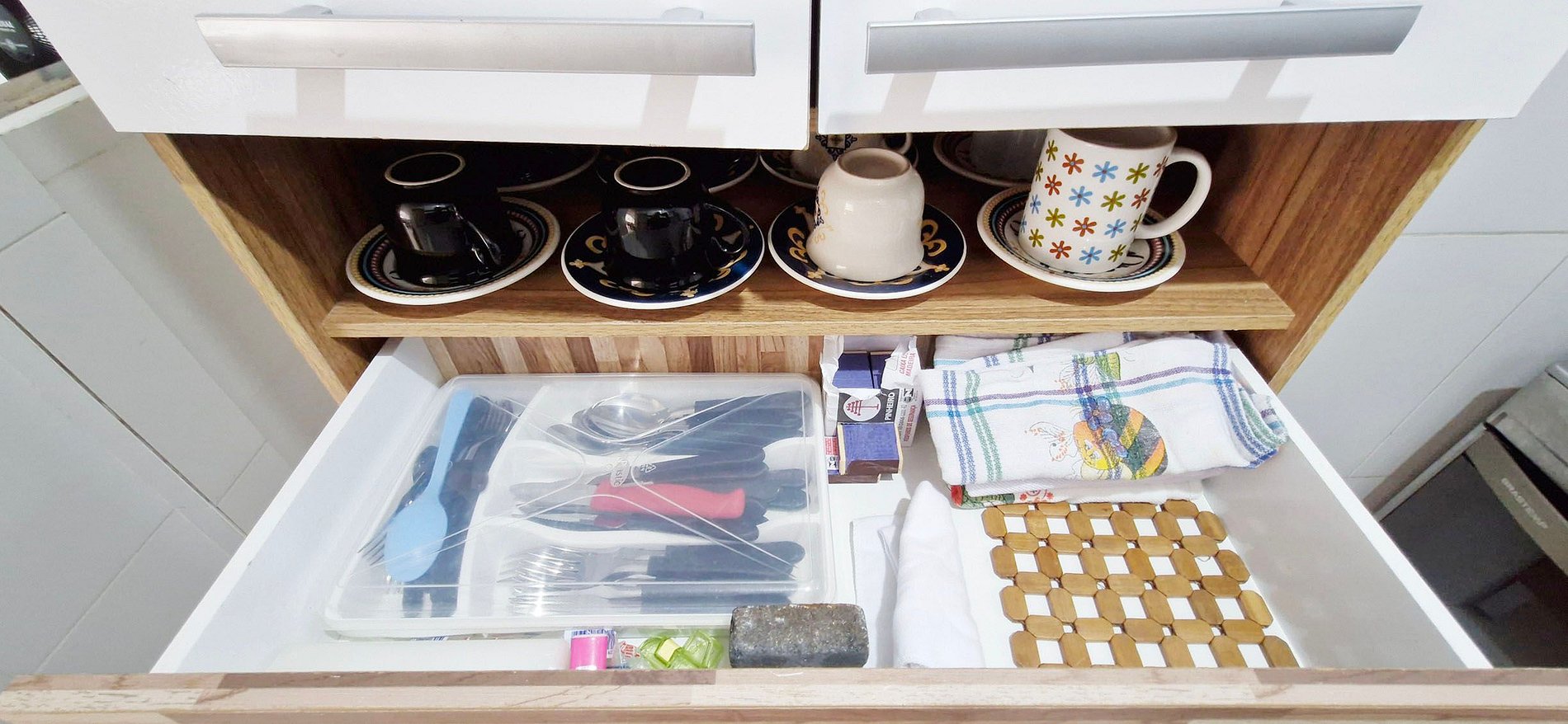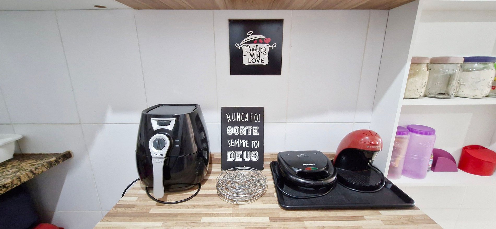 COZINHA: fogão 4 bocas, depurador de ar, microondas, airfryer, liquidificador, sanduicheira, cafeteira elétrica, cooler, panelas, potes, garrafa térmica, talheres, copos, taças e acessórios de cozinha
