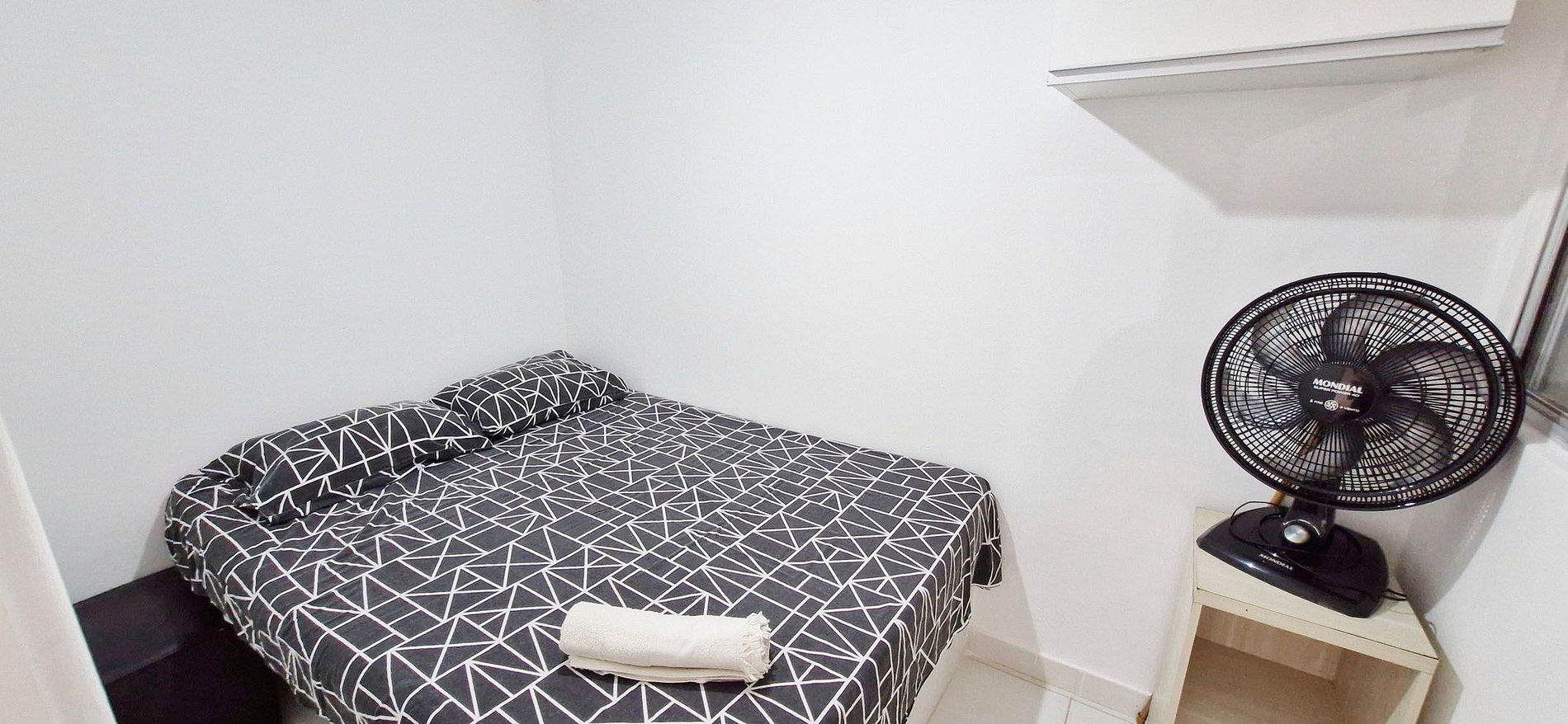 QUARTO 1: cama de casal, mesa de cabeceira, ventilador de mesa