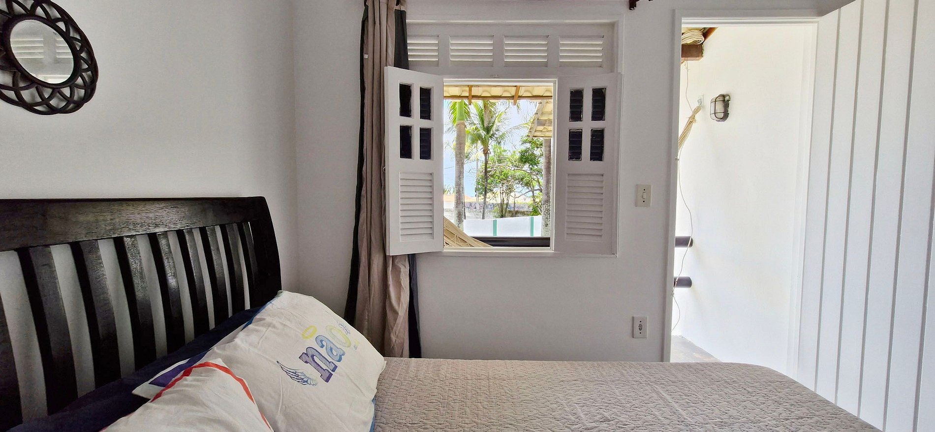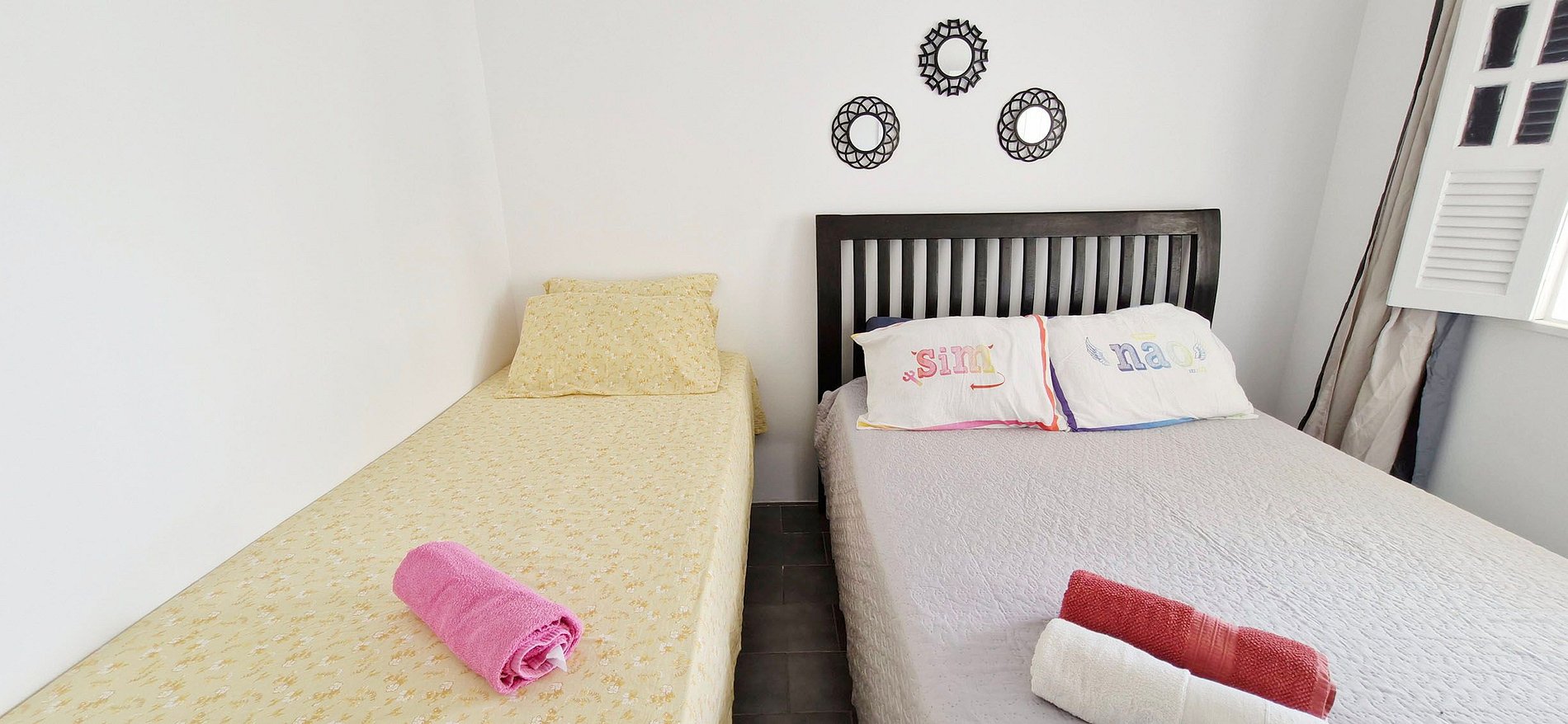 QUARTO 2 (com varanda): cama casal, cama solteiro, cortina blackout, ventilador de mesa, guarda-roupa, varanda com rede de descanso