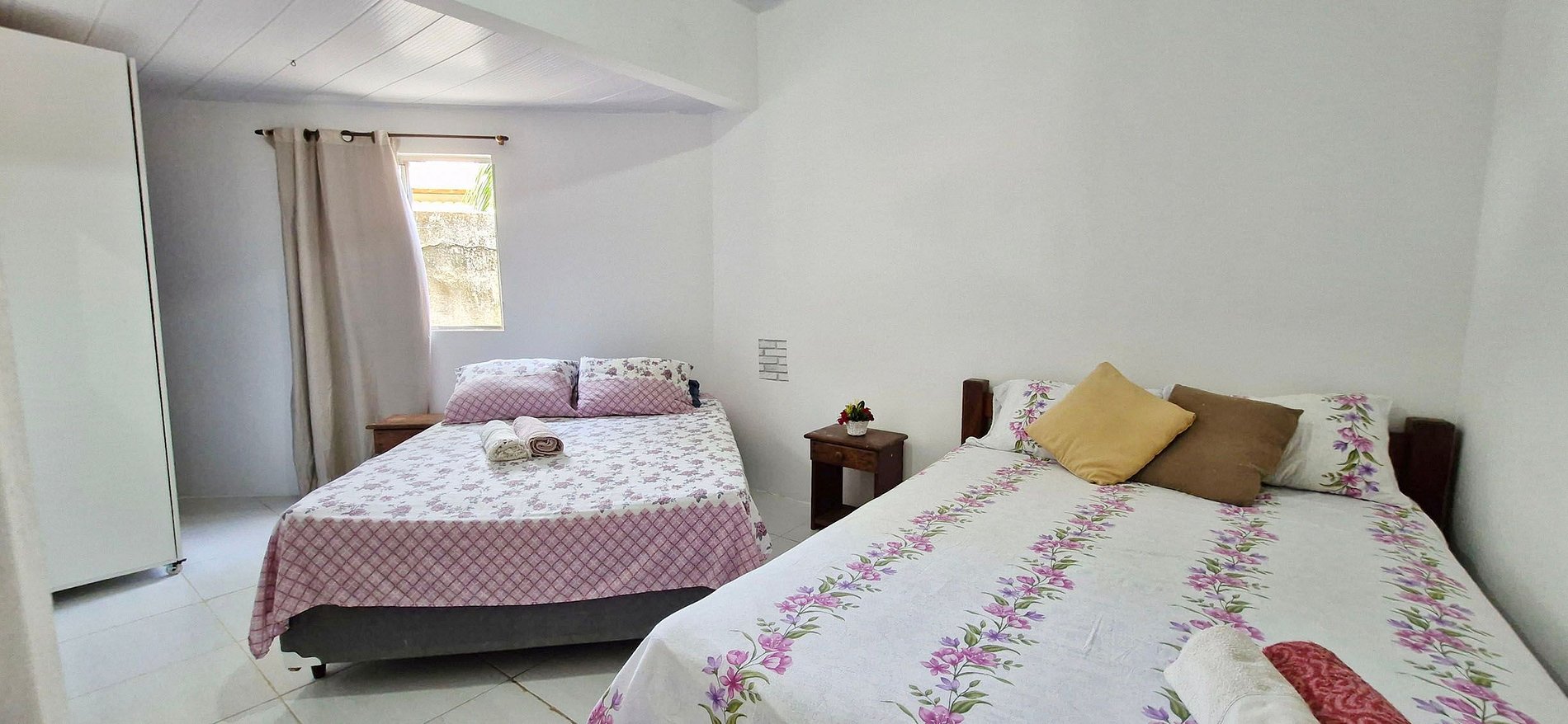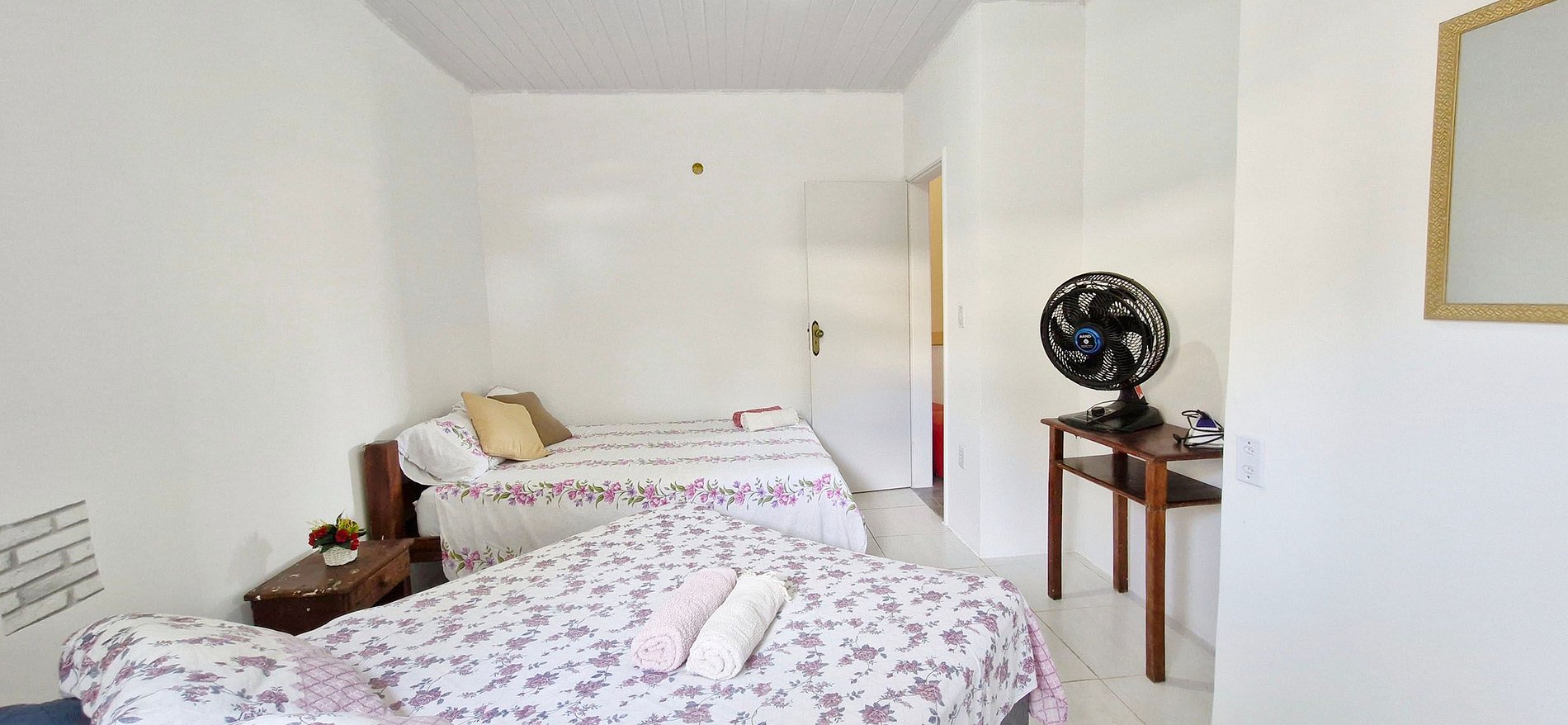 QUARTO 3: 2 camas de casal, mesa de cabeceira, ventilador de mesa, cortina blackout, espelho, guarda-roupa, ferro de passar