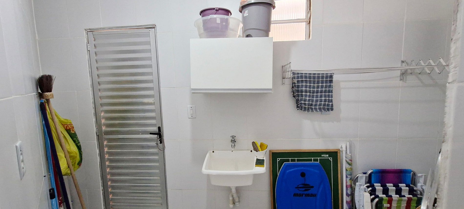 ÁREA DE SERVIÇO: pia, varal de parede, balde, bacia, mesa de botão, bodyboard, máquina de lavar, cadeiras de praia