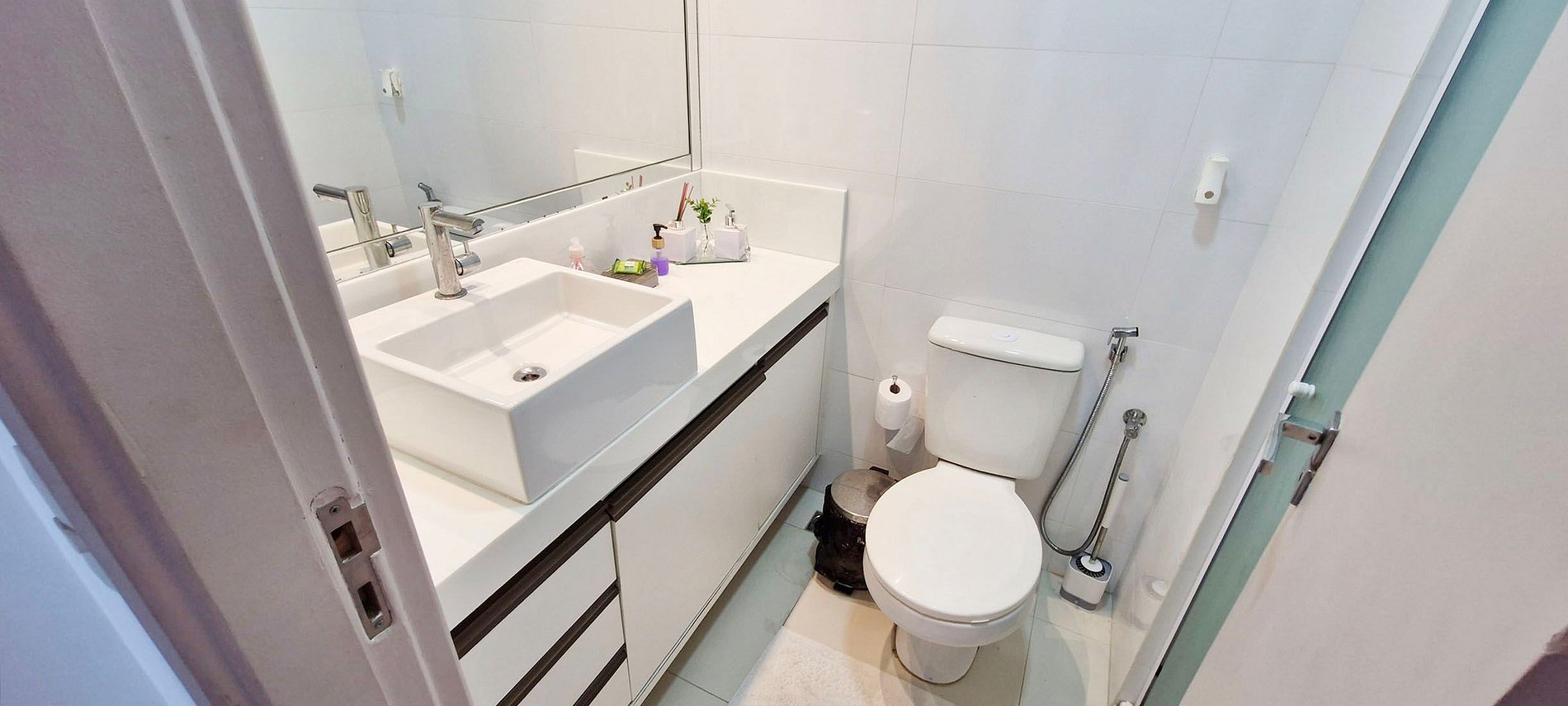 - Pia, armário, espelho, box, ducha higiênica e chuveiro elétrico