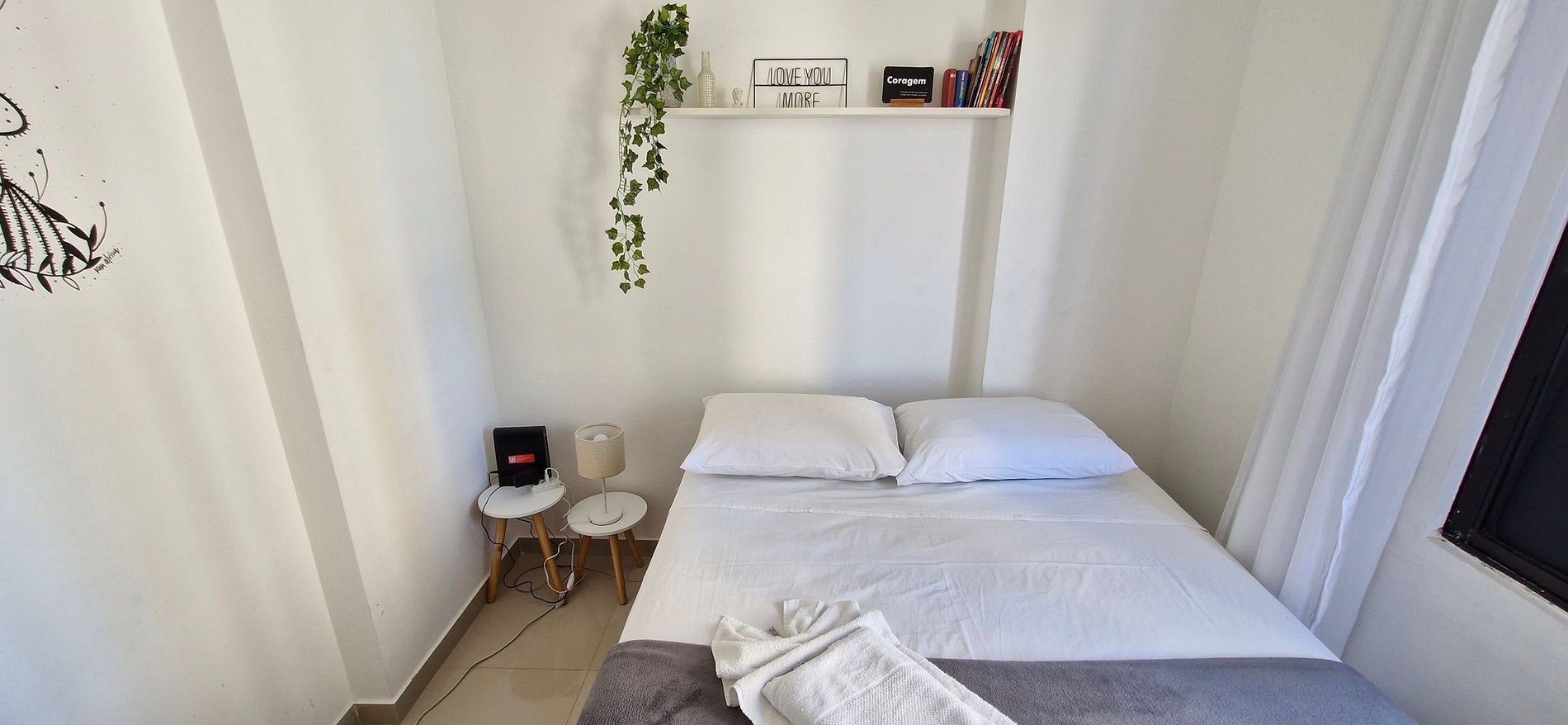 - Cama de casal, 2 mesas de cabeceira, abajur, modem, ventilador de teto, guarda-roupas, cortina blackout, ferro de passar