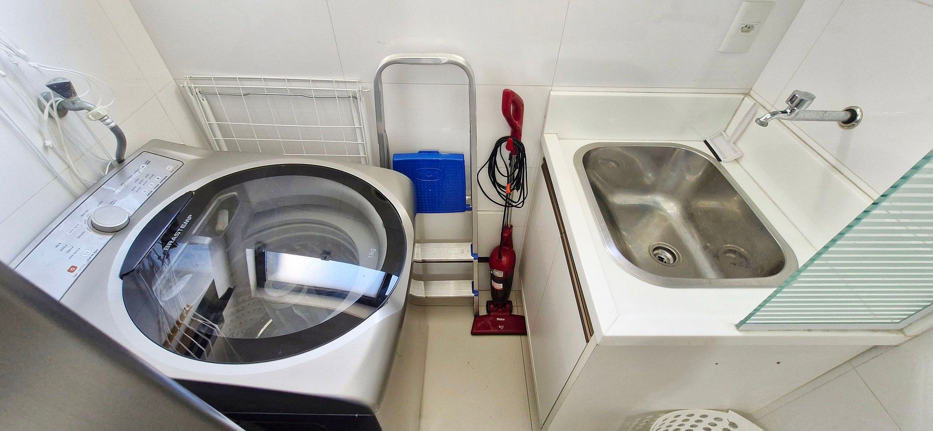 - Pia, máquina de lavar, varal de teto e de pé, aspirador de pó, escada 3 degraus