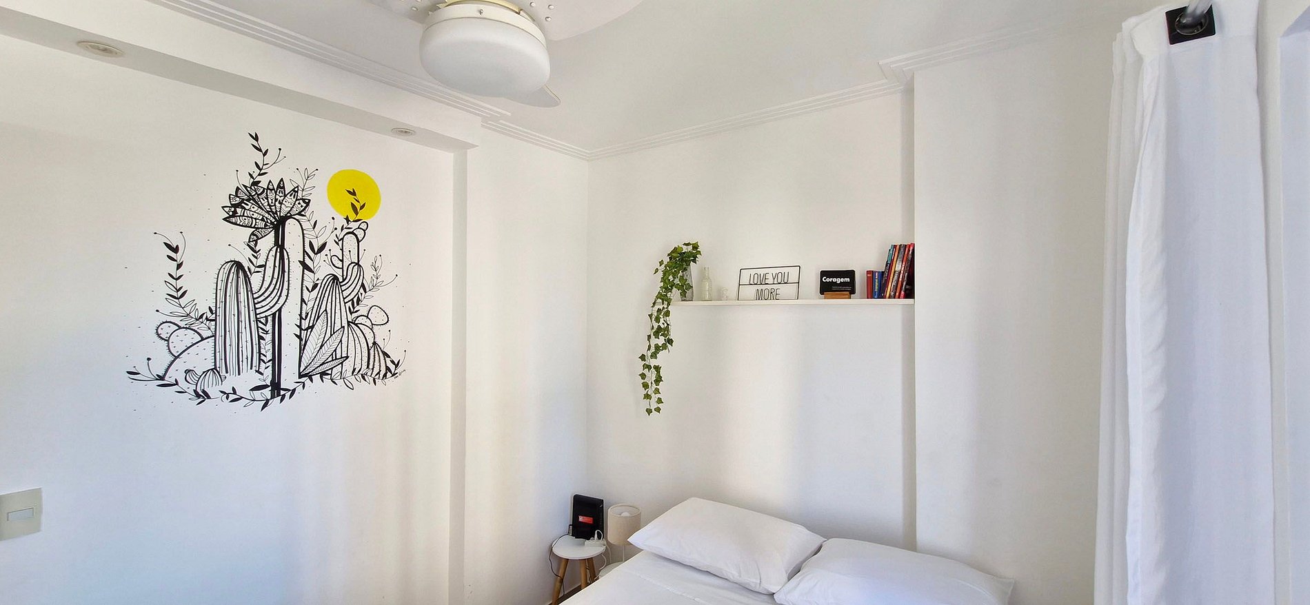 - Sofá 2 lugares com 2 almofadas, rack com smart TV (apps e canais locais), mesa de trabalho com cadeira, ventilador de mesa, filtro de linha, cortina, objetos decorativos