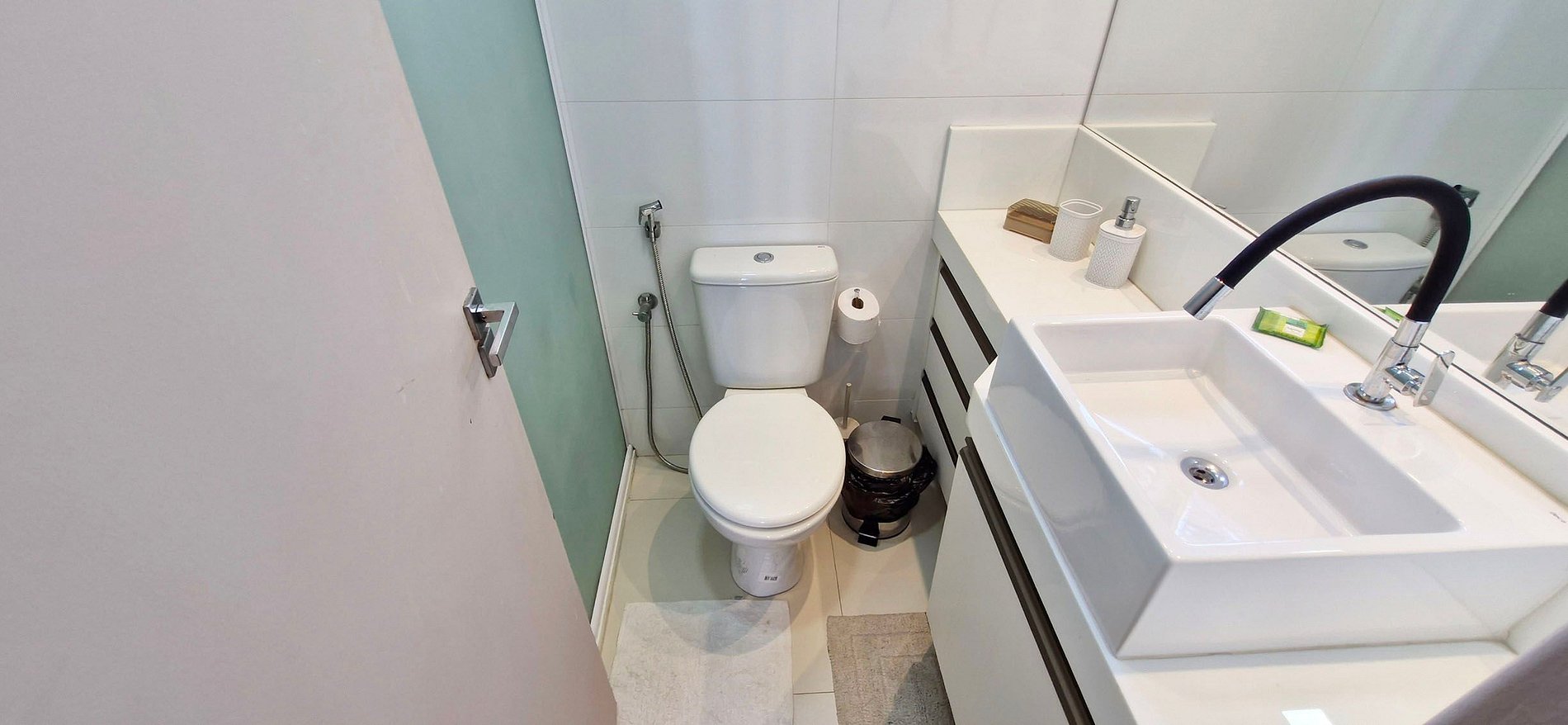 - Pia, armário, espelho, box, ducha higiênica e chuveiro elétrico