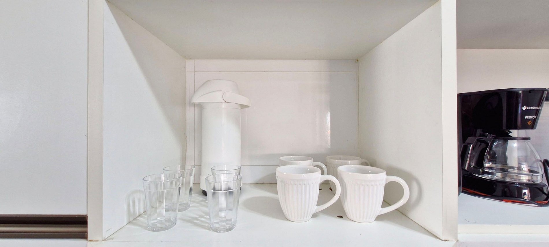 - Cooktop 4 bocas a gás, geladeira duplex, forninho elétrico, filtro de água, sanduicheira, cafeteira elétrica, liquidificador, garrafa térmica, talheres, copos, taças, panelas e itens básicos de cozinha