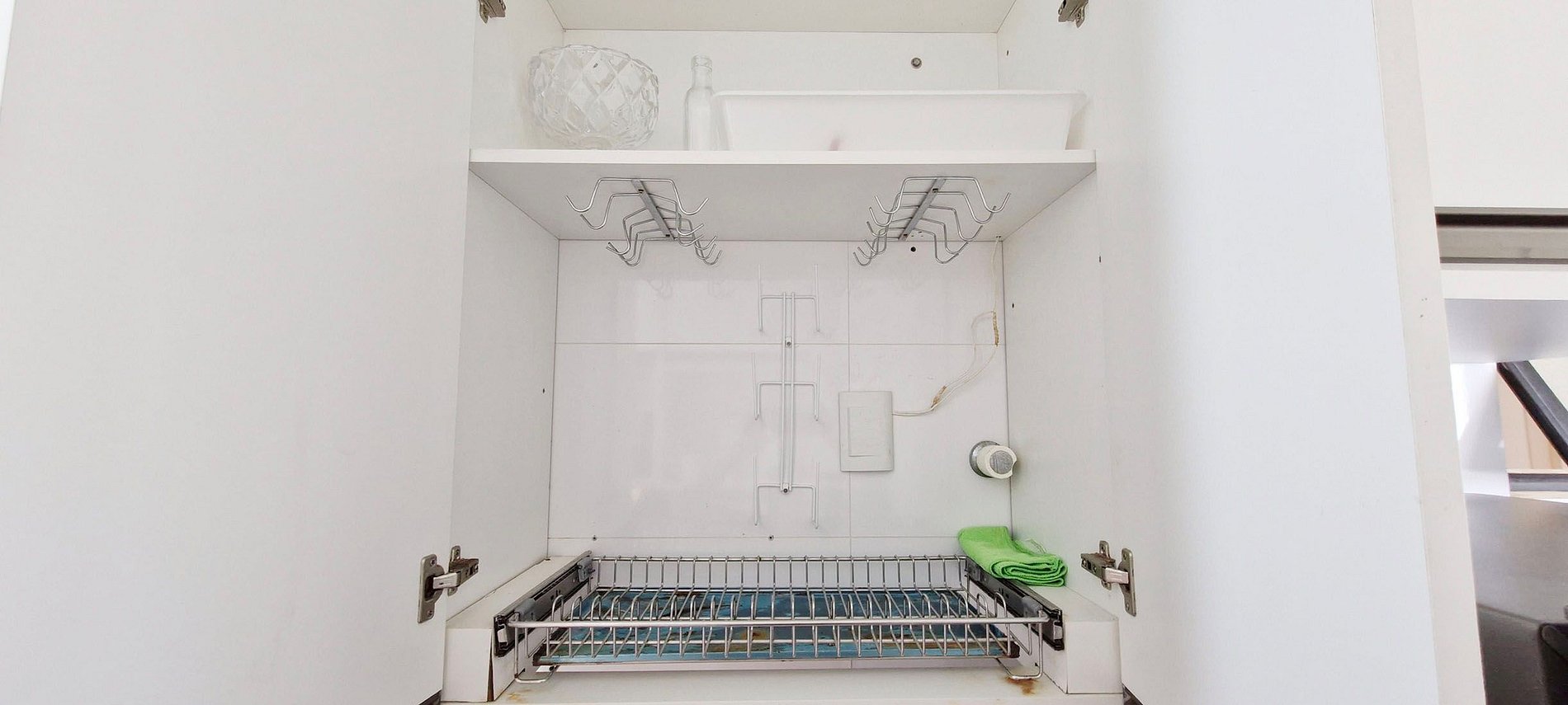 - Pia, máquina de lavar, varal de teto e de pé, aspirador de pó, escada 3 degraus