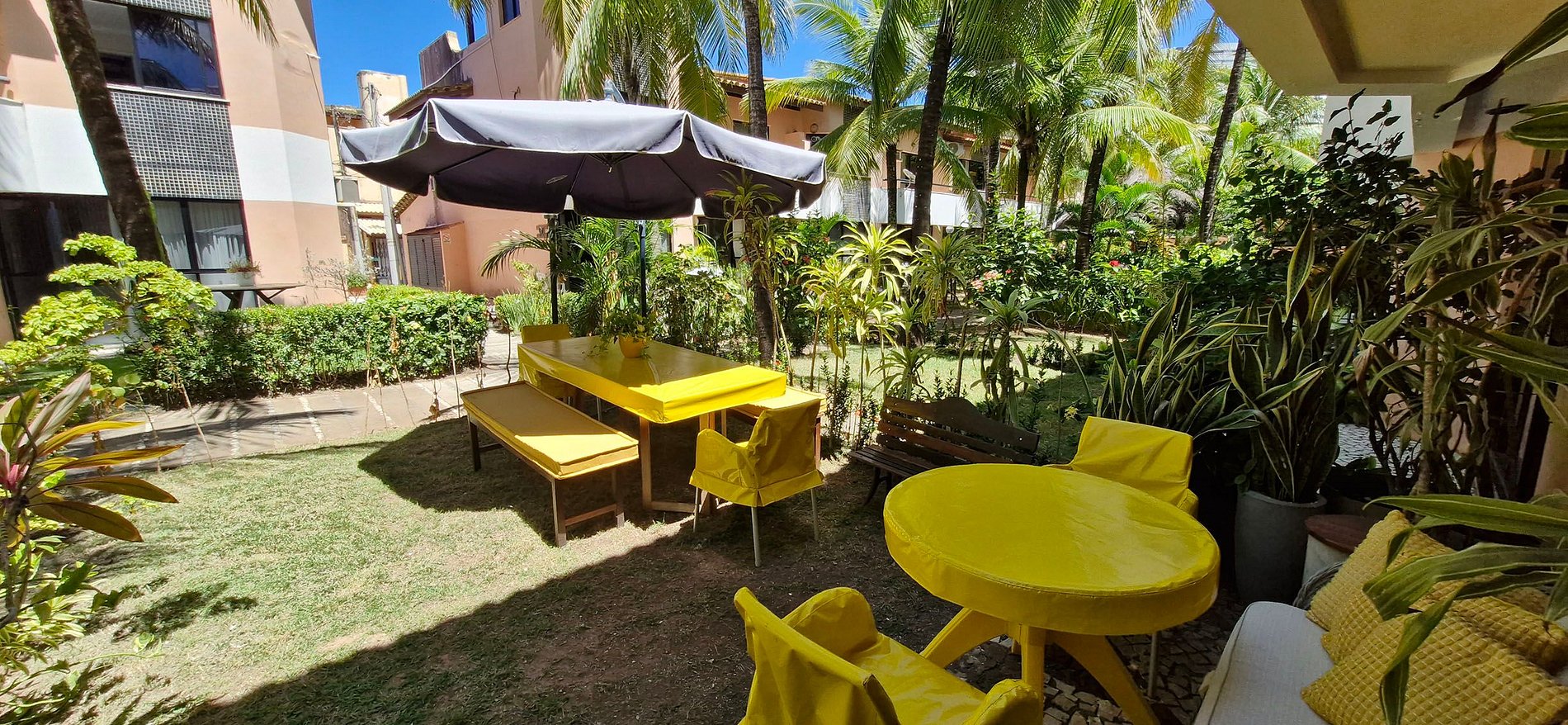 - JARDIM com guarda-sol, 2 mesas, sofá, 3 bancos e 4 cadeiras