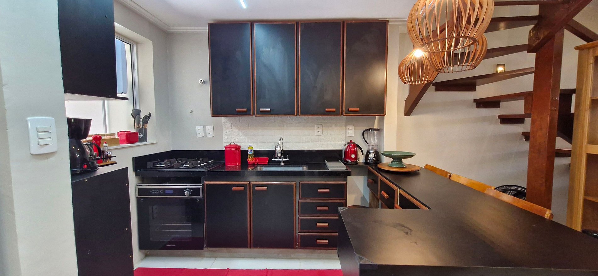 - COZINHA com bancada e 5 cadeiras, geladeira duplex, armários, cooktop a gás, forno, forninho elétrico, liquidificador, chaleira, airfryer, microondas, sanduicheira, cafeteira elétrica, filtro de água, batedeira, cuscuzeira, panela de pressão e itens básicos de cozinha