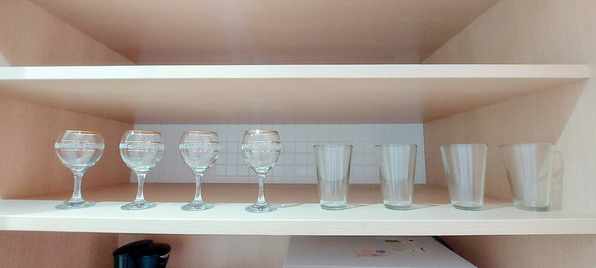 Possui ferro elétrico, frigobar e copa equipada com microondas, sanduicheira, cafeteira, talheres, saca rolhas, copos, pratos, xícaras, pia, escorredor de pratos e potes plásticos.