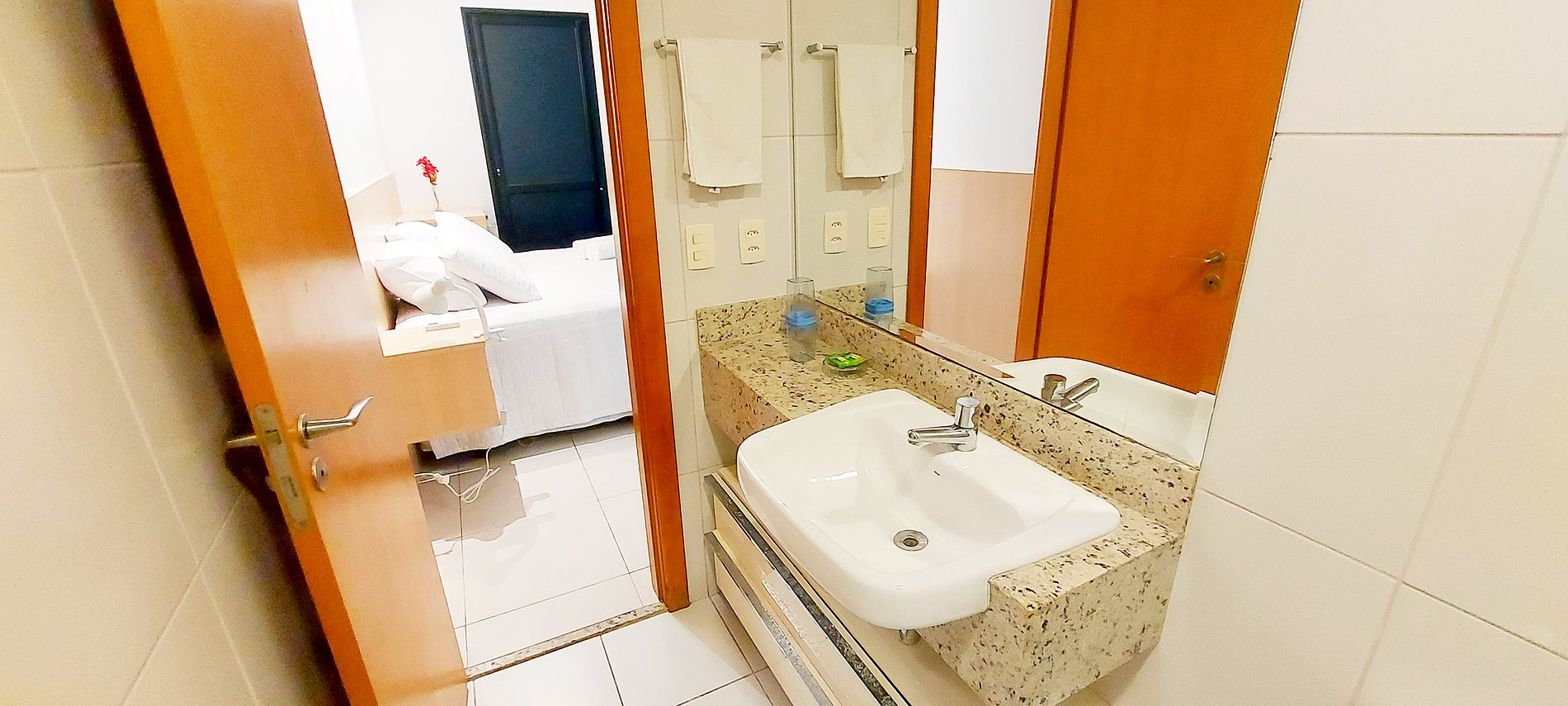 O apartamento é exclusivo para o hóspede. O condomínio tem uma recepção no térreo, restaurante, piscina, sauna e academia disponíveis