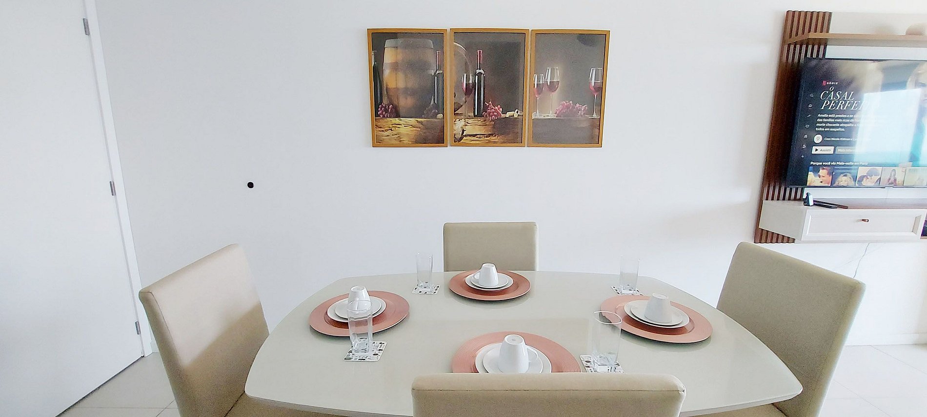 - Sala de estar com mesa e 4 cadeiras, sofá-cama de casal, 2 mesinhas de canto redondas, rack com SMART TV e canais locais, WI-FI, ventilador de teto, quadros decorativos