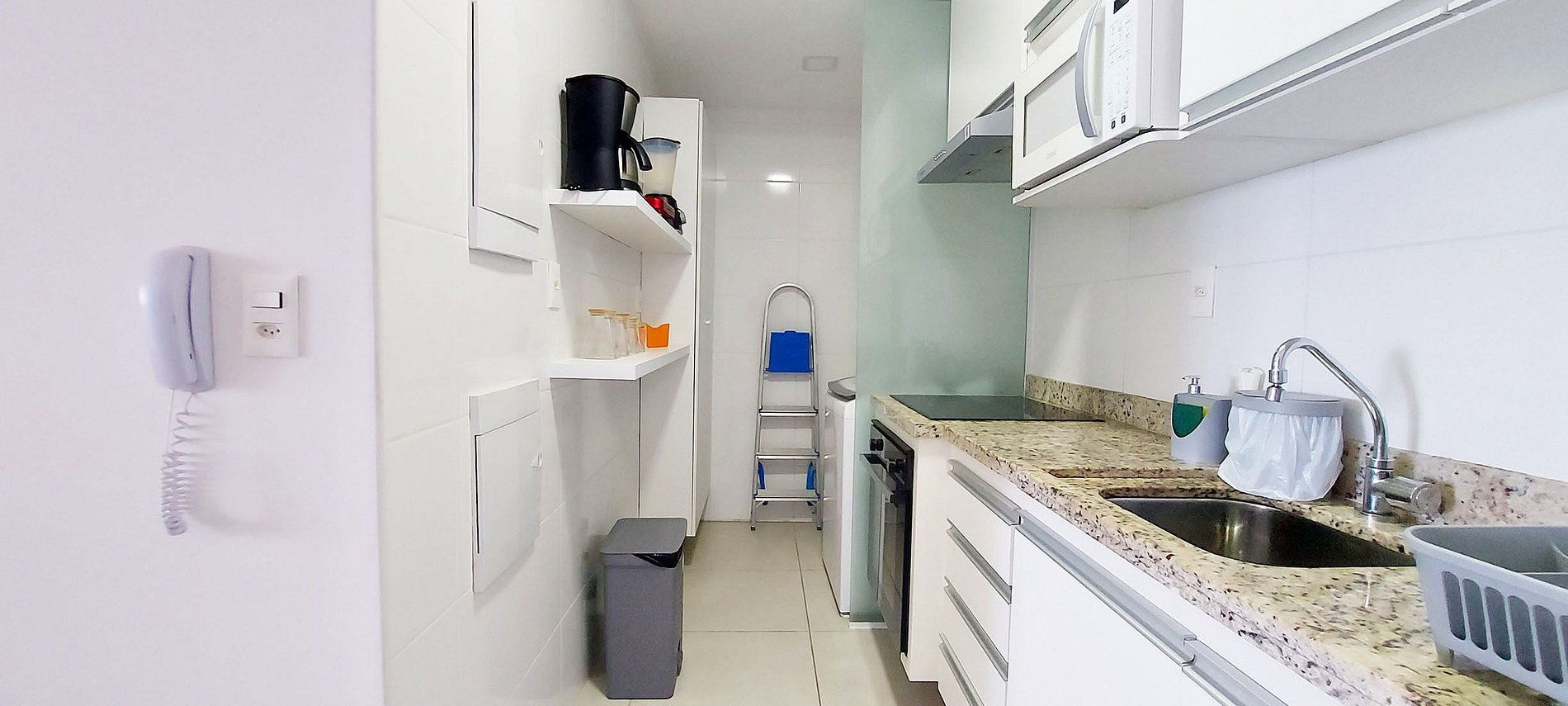 - Cozinha com fogão cooktop de indução, forno elétrico com função airfryer, geladeira duplex, microondas, depurador de ar, liquidificador, sanduicheira, cafeteira elétrica, copos, taças, panelas e acessórios de cozinha. Não tem filtro de água.