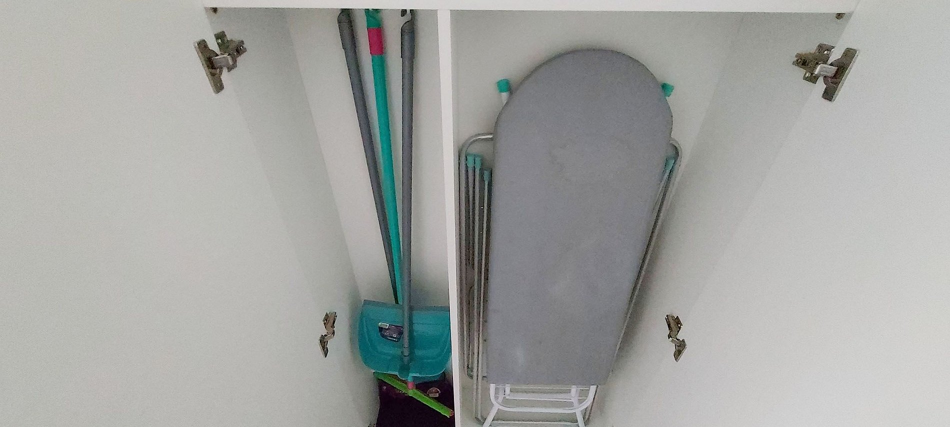 - Área de serviço com pia, máquina de lavar, ferro de passar, escada de 4 degraus, tábua de passar, varal de pé, vassoura, rodo e pá