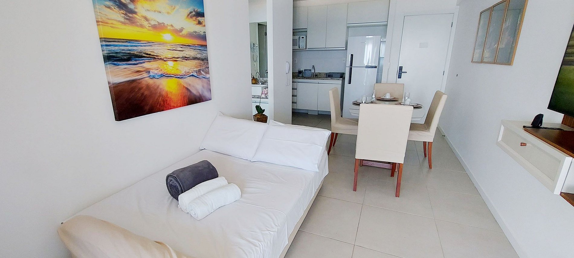 - Sala de estar com mesa e 4 cadeiras, sofá-cama de casal, 2 mesinhas de canto redondas, rack com SMART TV e canais locais, WI-FI, ventilador de teto, quadros decorativos