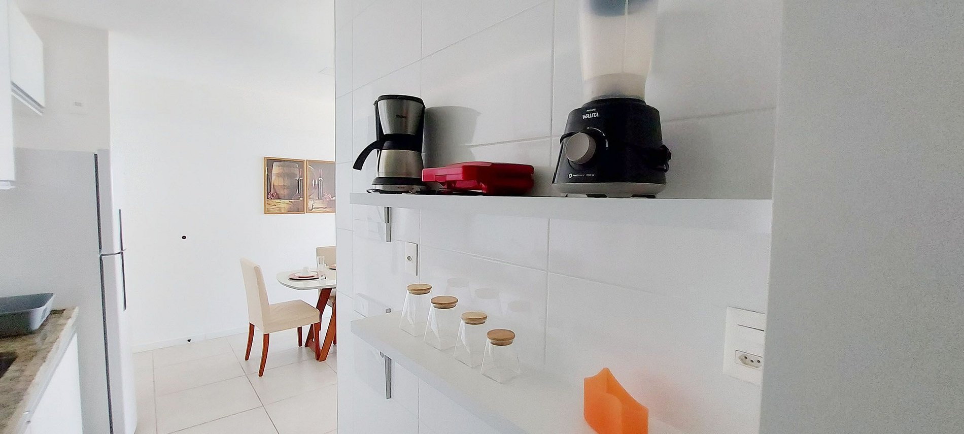 - Cozinha com fogão cooktop de indução, forno elétrico com função airfryer, geladeira duplex, microondas, depurador de ar, liquidificador, sanduicheira, cafeteira elétrica, copos, taças, panelas e acessórios de cozinha. Não tem filtro de água.