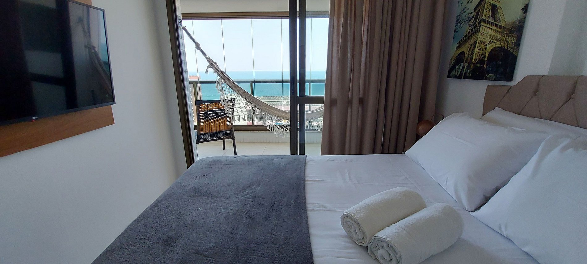 - Varanda com vista total do mar, 4 cadeiras e uma mesinha de vime, rede de descanso, janela Reiki