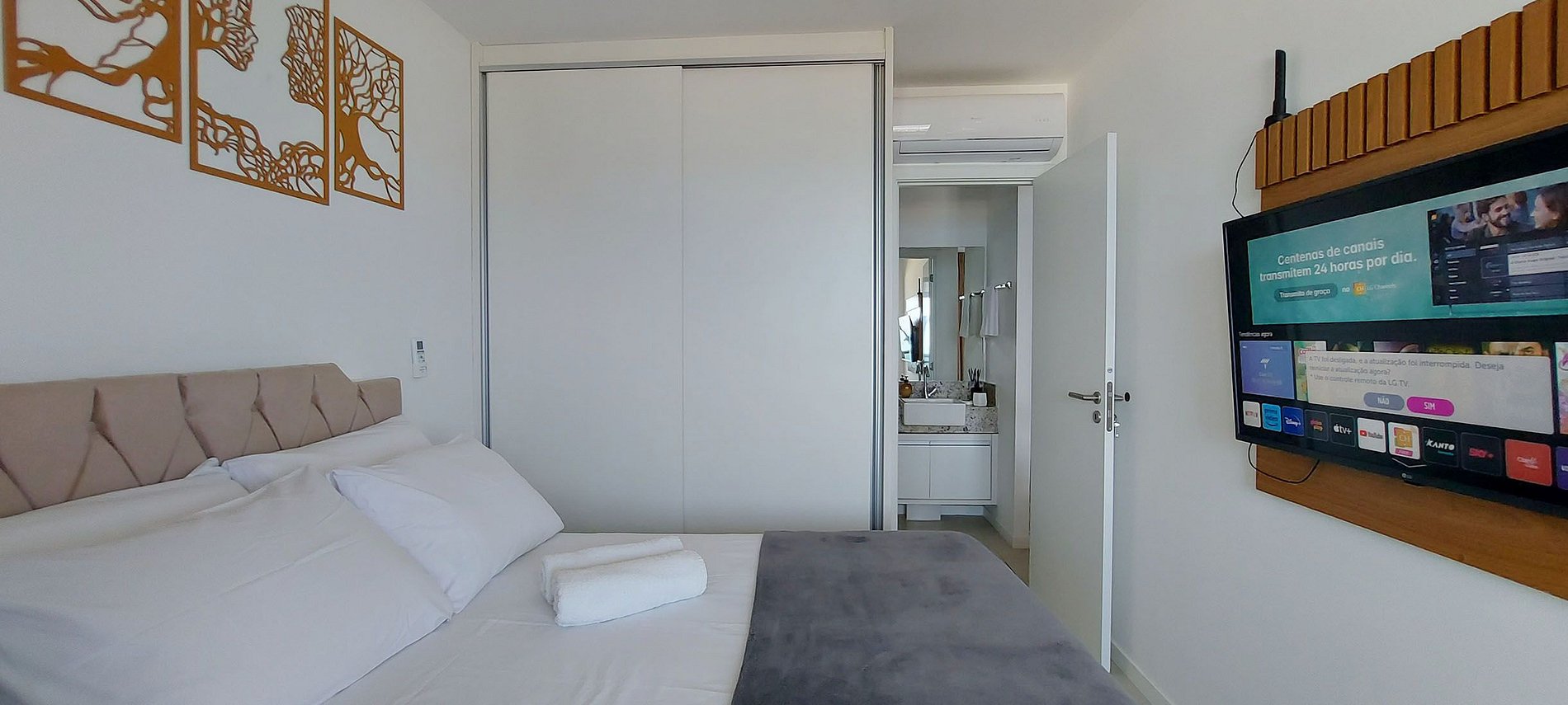 - Quarto com cama casal, 2 mesinhas de canto com abajur, guarda-roupa, ar condicionado split, cortina, smart TV