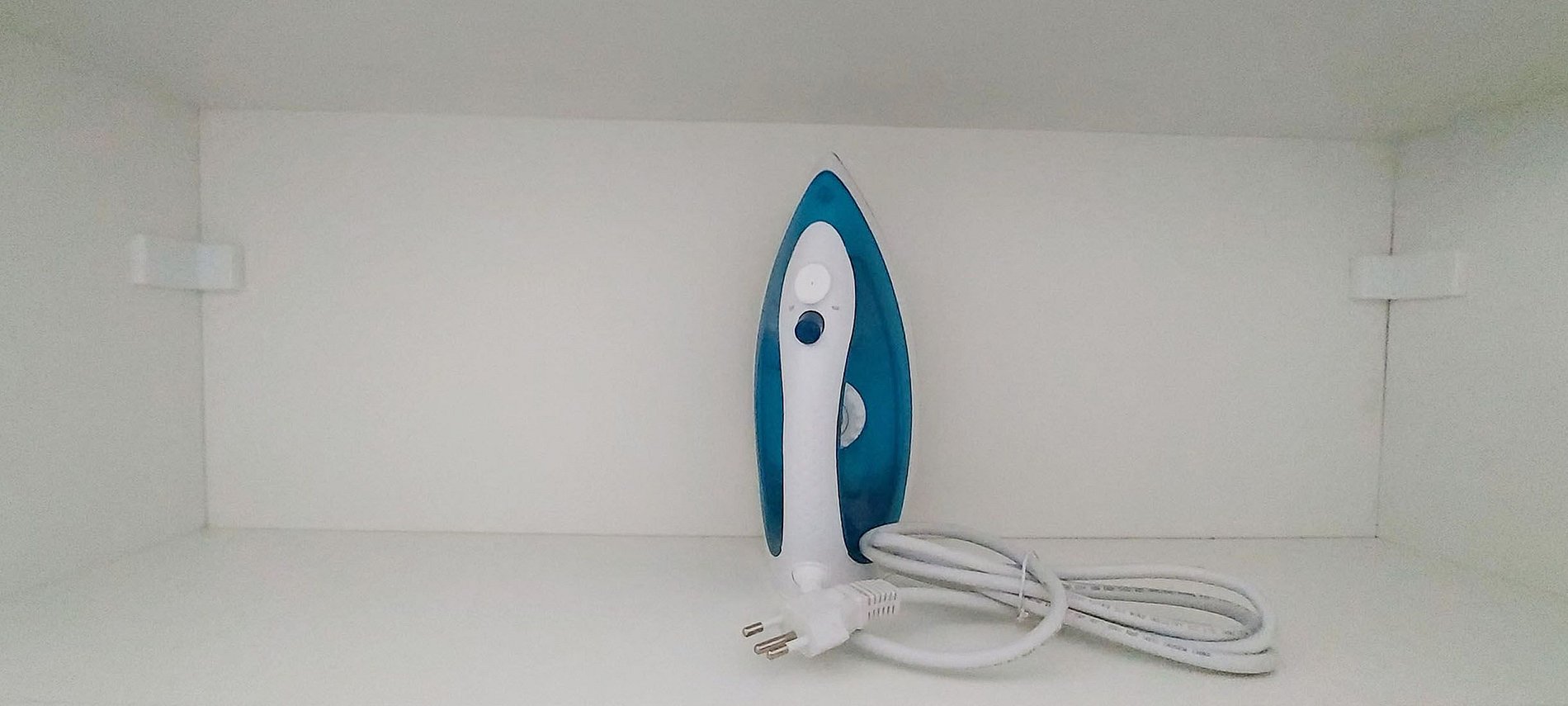 - Área de serviço com pia, máquina de lavar, ferro de passar, escada de 4 degraus, tábua de passar, varal de pé, vassoura, rodo e pá