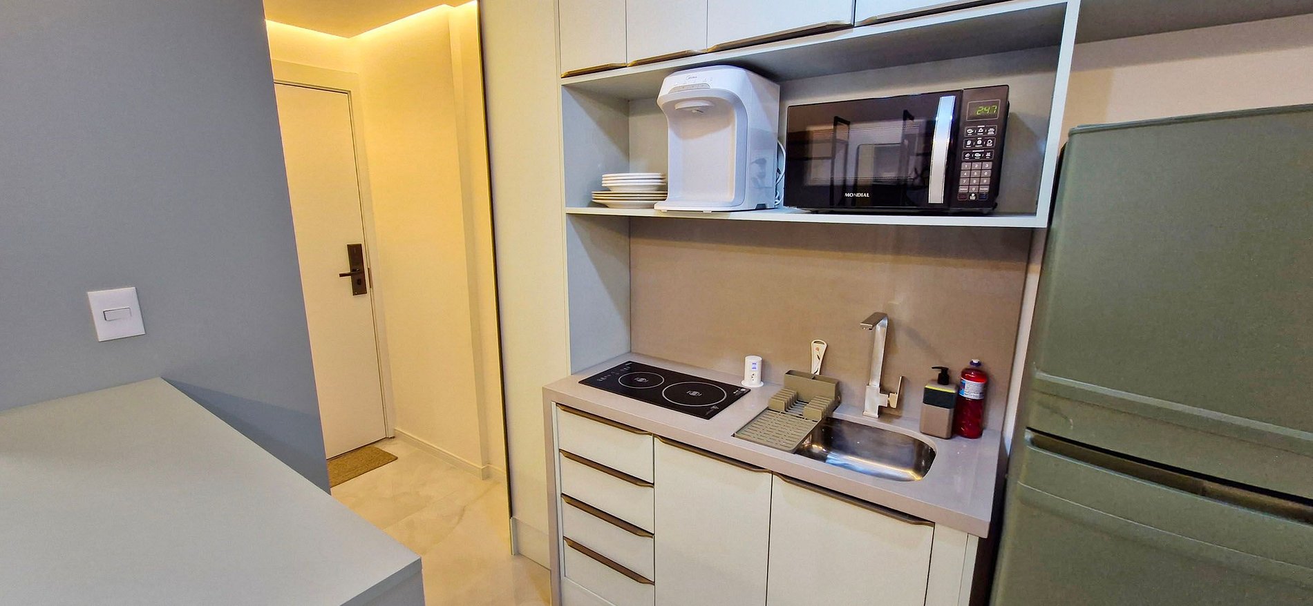 - COZINHA: bancada com 2 bancos altos, geladeira duplex, sanduicheira, garrafa térmica, liquidificador, microondas, cooktop duas bocas de indução, filtro de água, panelas, talheres, copos e acessórios de cozinha variados.