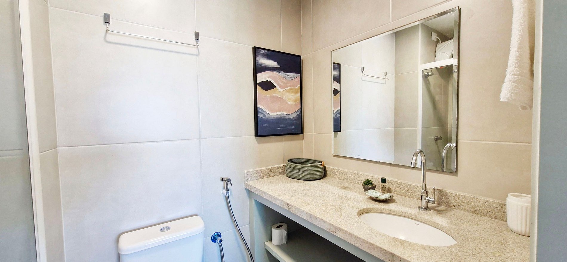 - SUÍTE: cama casal, cama auxiliar de solteiro, guarda-roupa, espelho grande, mesa de trabalho com cadeira e abajur, smart TV (apps e TV aberta), WI-FI, ar condicionado split, cortina blackout, luz LED. BANHEIRO: armário, espelho, chuveiro elétrico, ferro de passar.