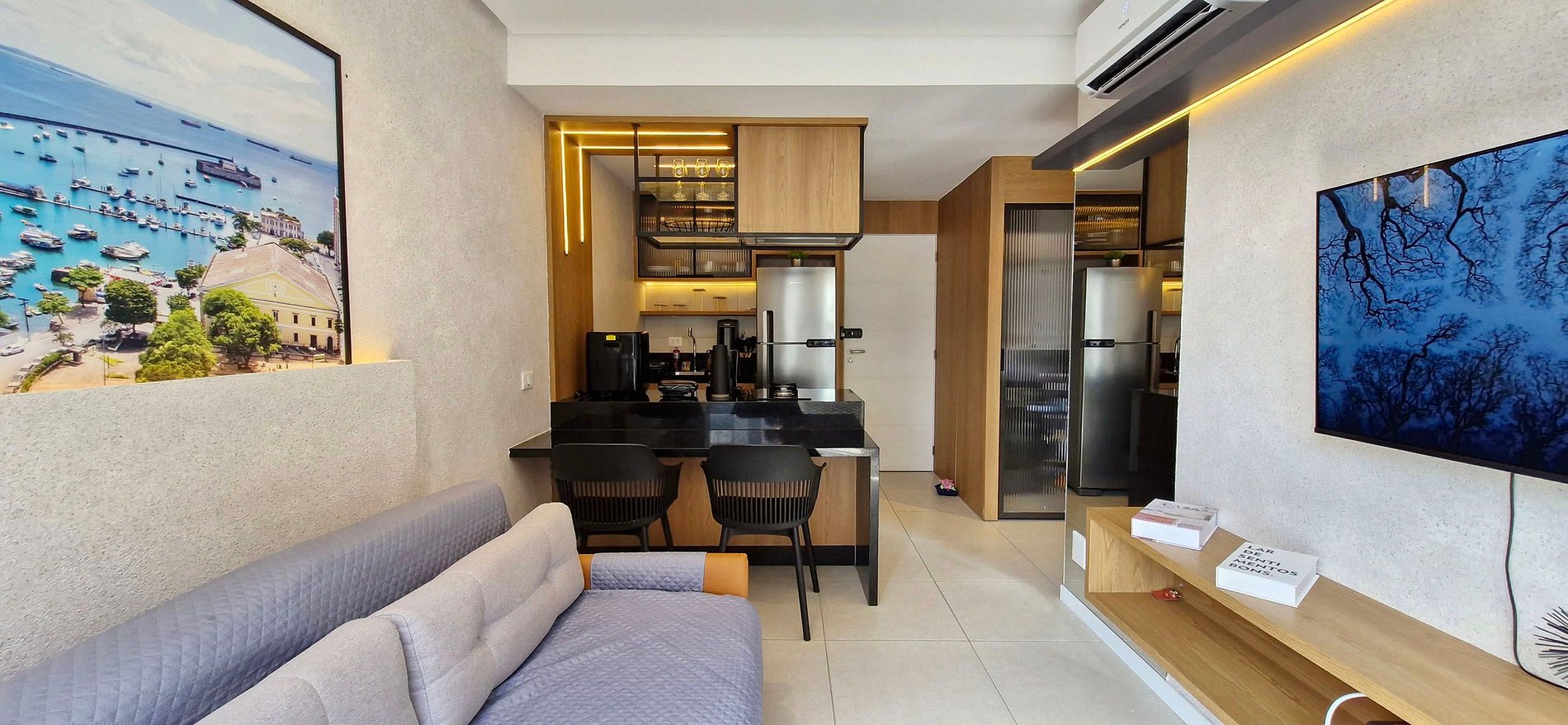 Lindo apartamento climatizado, bem decorado, para 4 pessoas, localizado em condomínio novo na Barra! Pertinho do shopping Barra e do circuito do Carnaval Barra-Ondina! Com smart TV e ar condicionado split na sala e no quarto, WI-FI, cozinha completa. Cobertura com piscina e academia. Tem garagem e recepção 24hs.