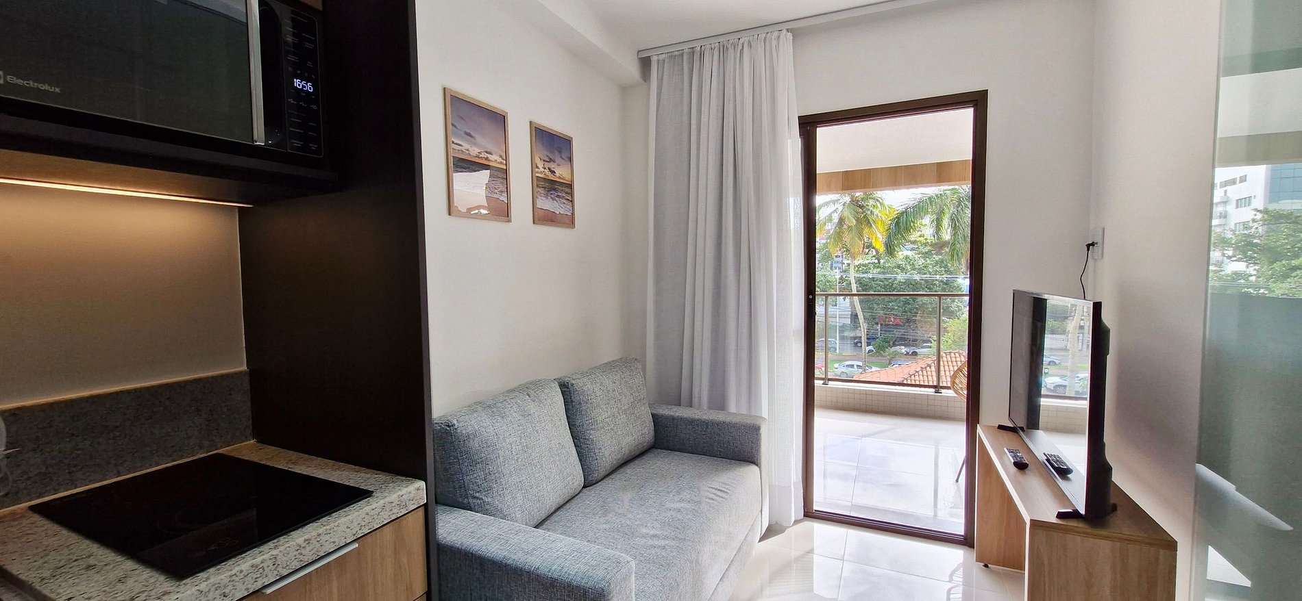 - Sofá, rack com smart TV com apps e canais locais, cortina blackout
