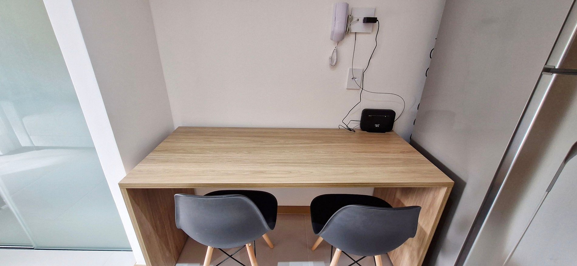 - Mesinha com duas cadeiras, geladeira duplex, microondas, cooktop de indução 2 bocas, filtro de água, sanduicheira, cafeteira elétrica, liquidificador, panelas básicas, copos, taças, pratos e acessórios de cozinha variados.
