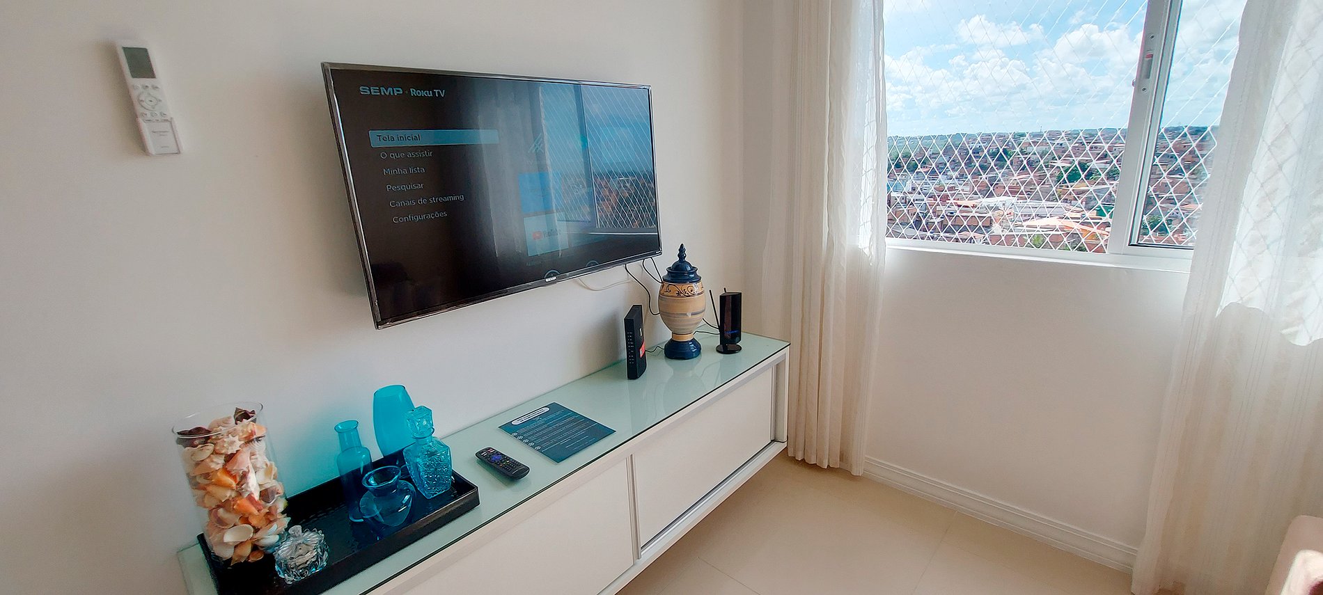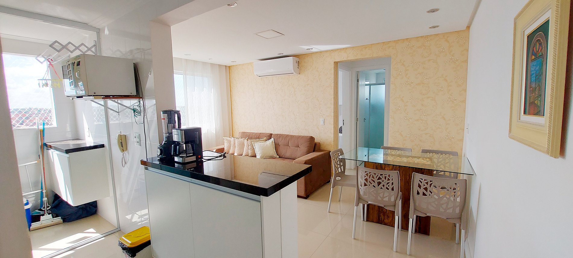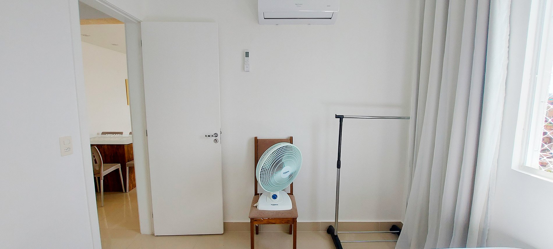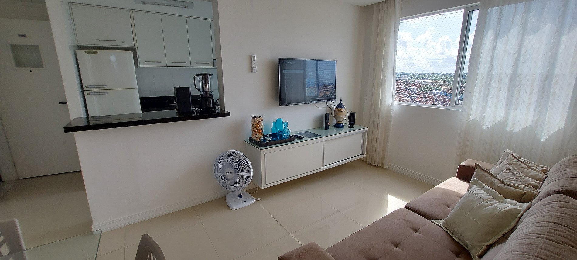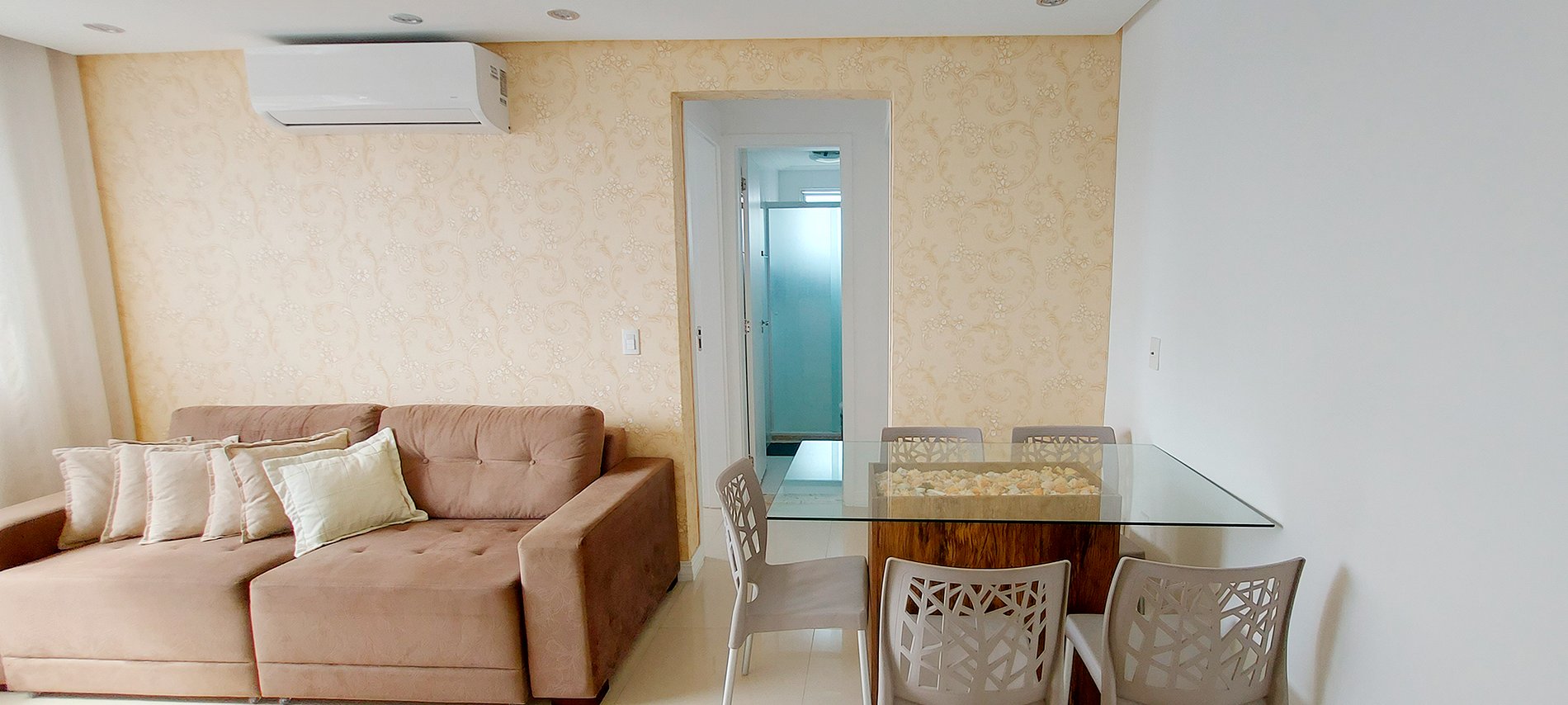 - Sala de estar com mesa de vidro com 5 cadeiras, sofá 4 lugares com 6 almofadas, rack com smart TV, wifi, ventilador de mesa, cortina fina, rede de proteção na janela e ar condicionado split.