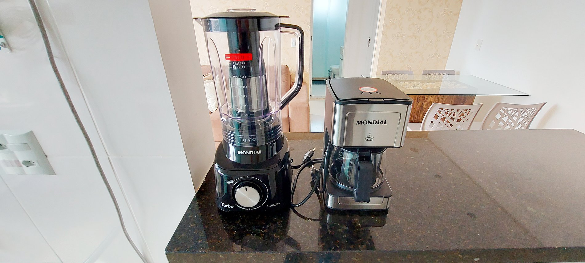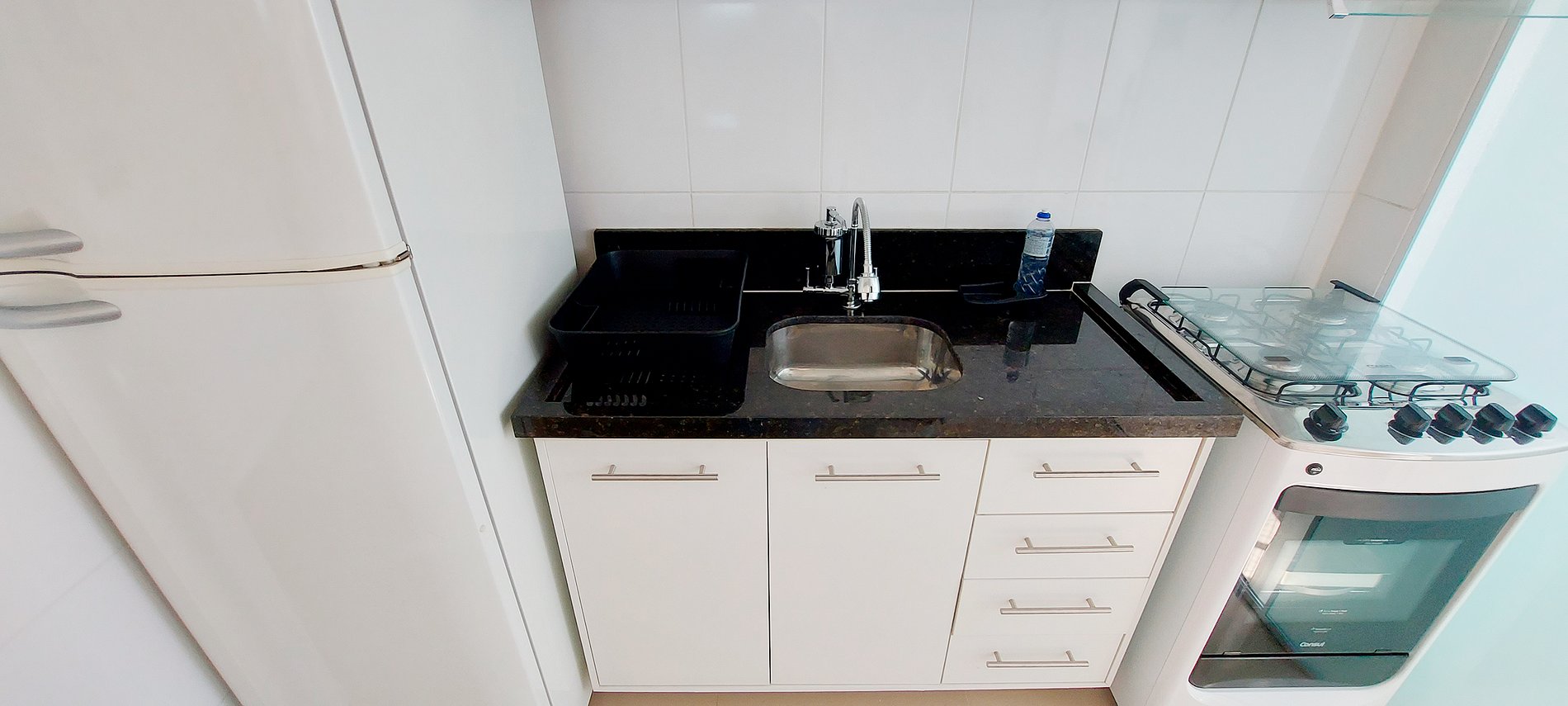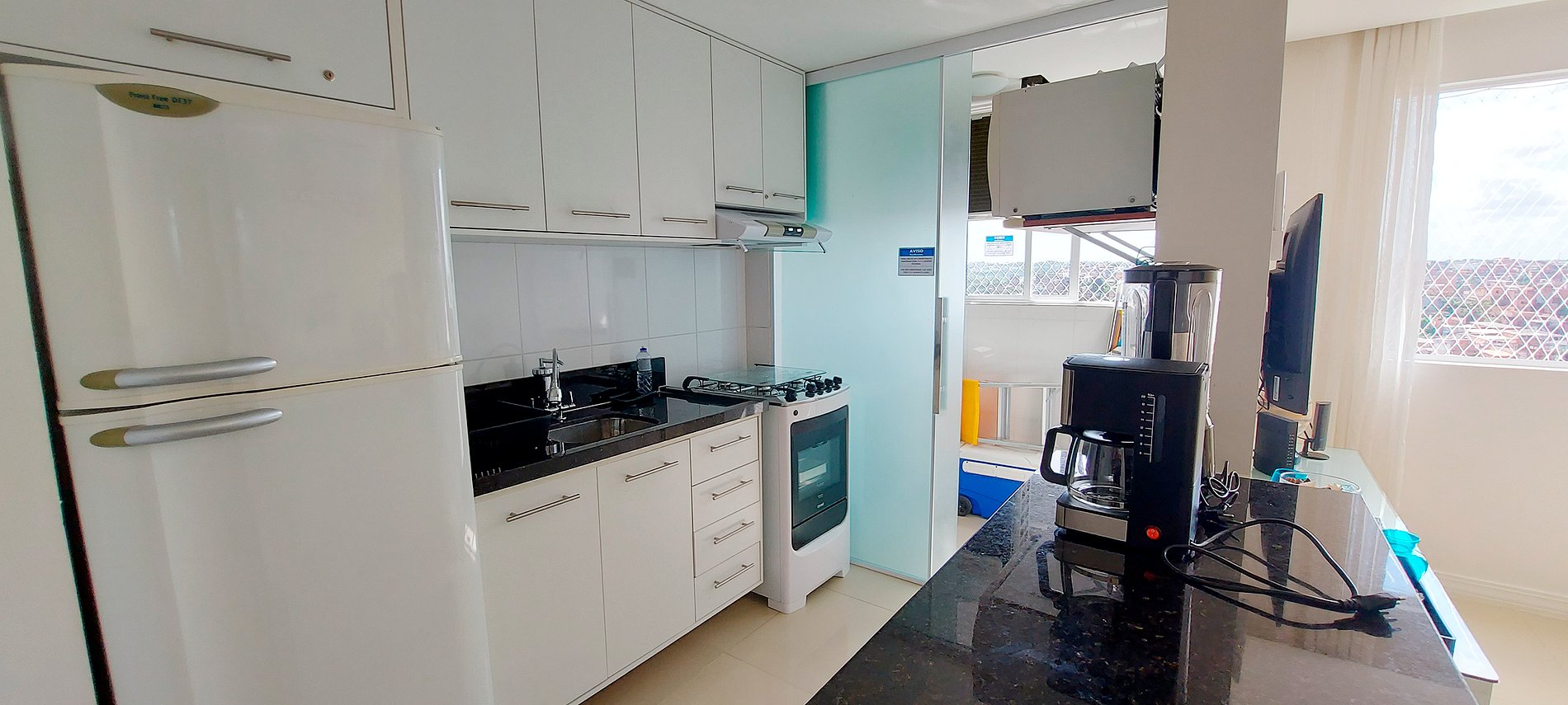 - Cozinha americana com geladeira duplex, liquidificador, cafeteira elétrica, micro-ondas, fogão 4 bocas, filtro de água, panela de pressão e itens básicos de cozinha