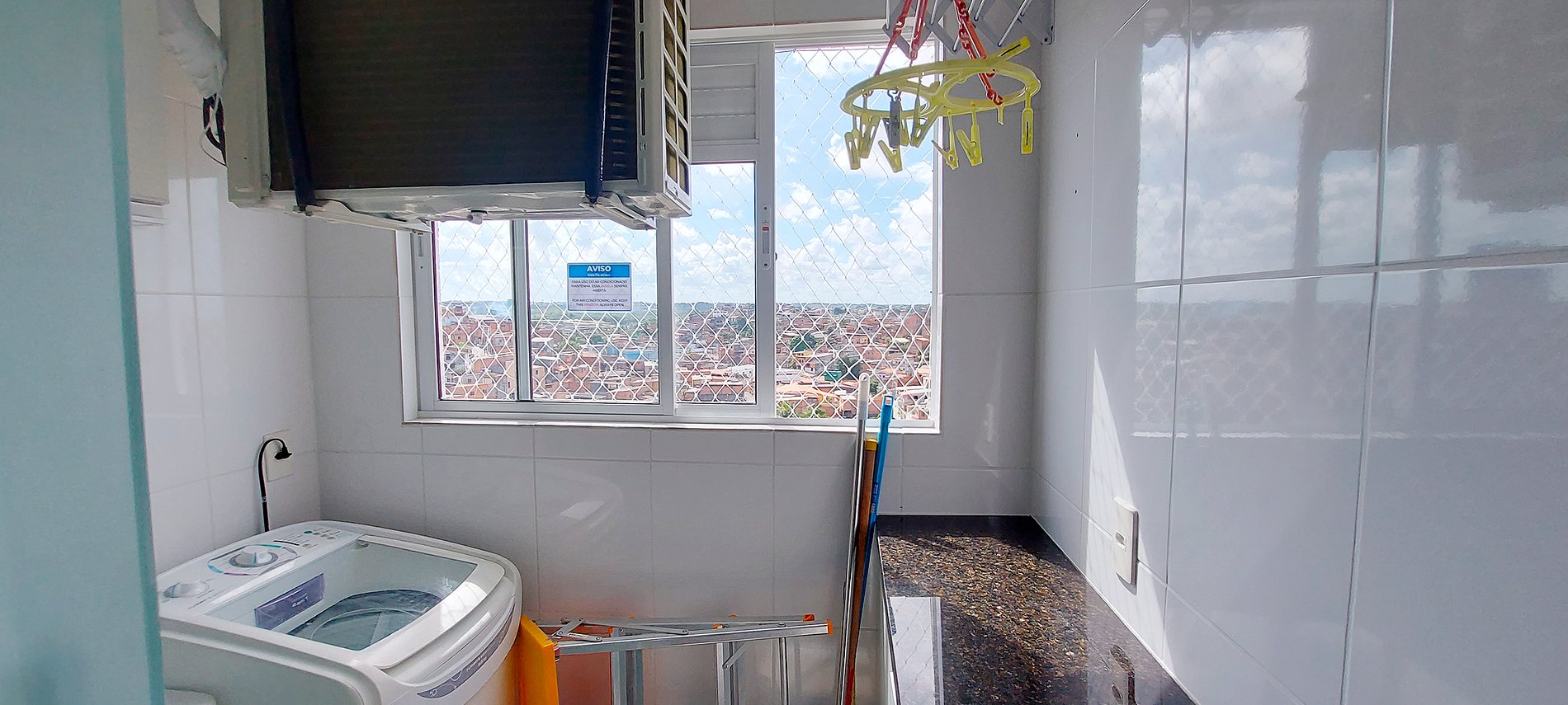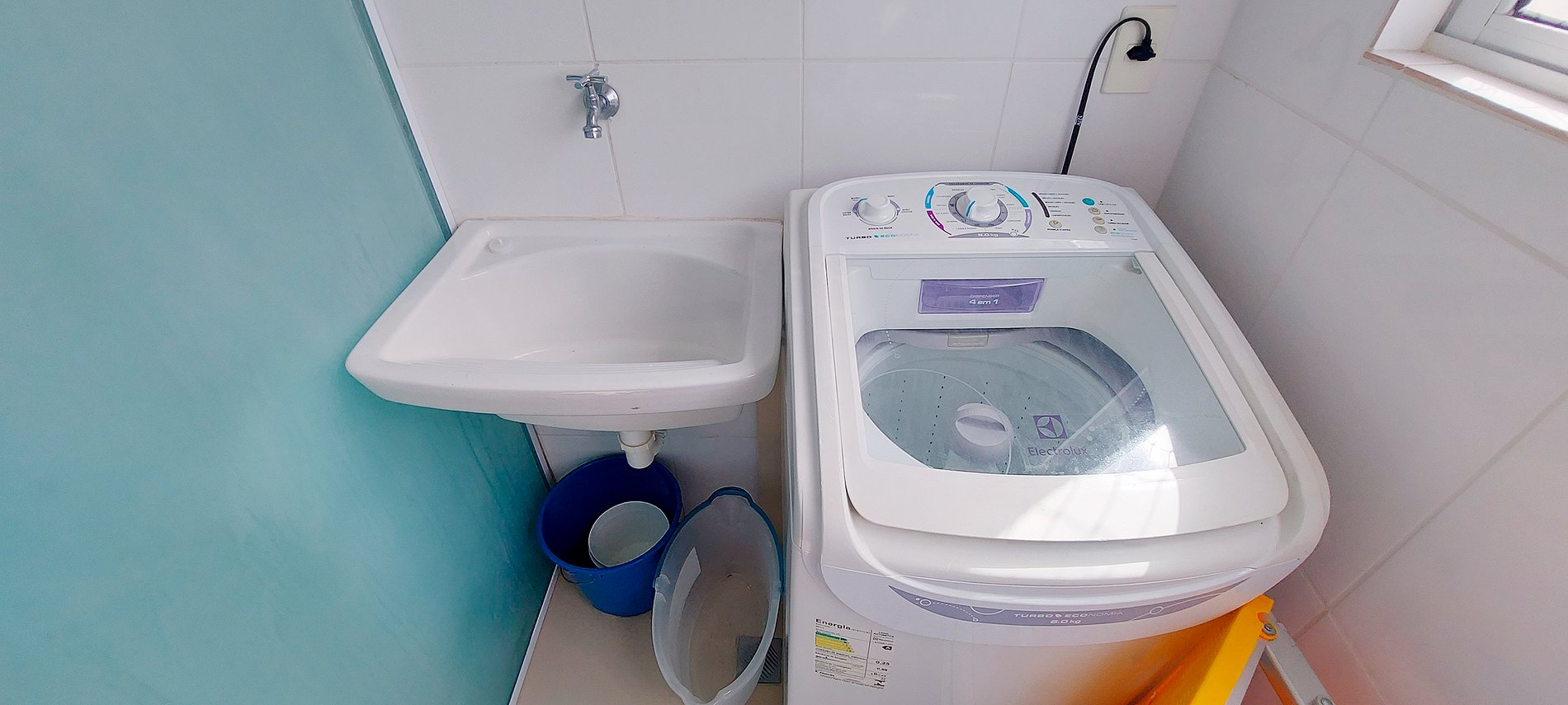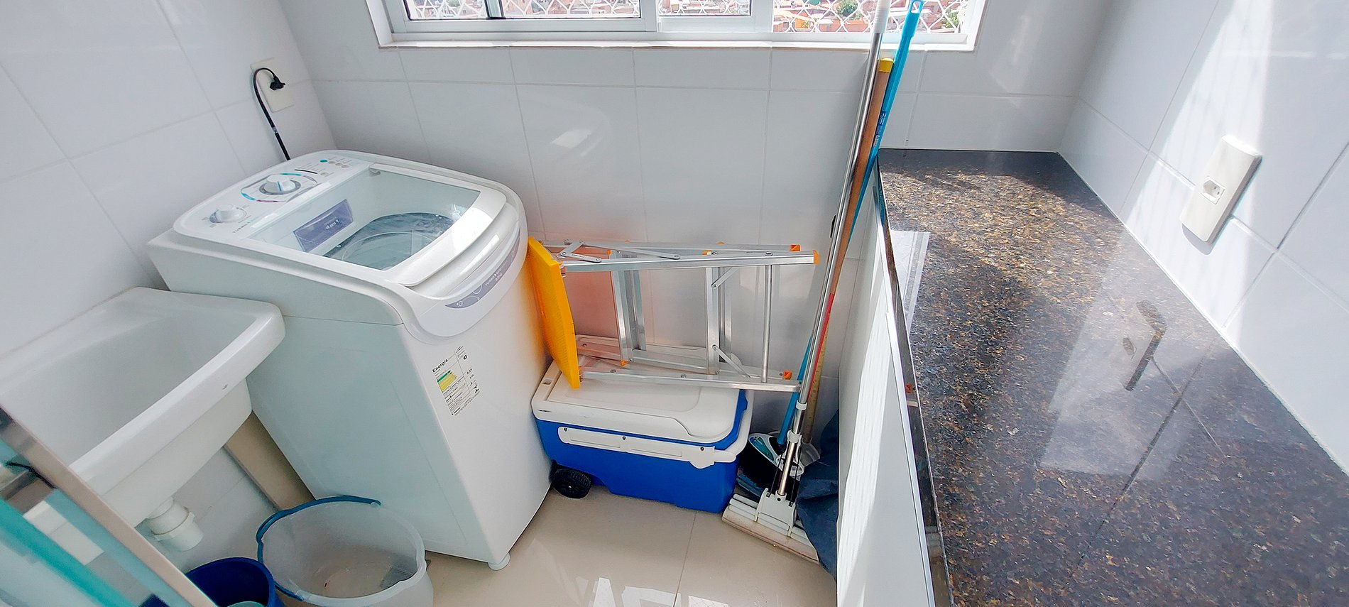 - Área de serviço com máquina de lavar, varal suspenso, pia, escada pequena, cooler