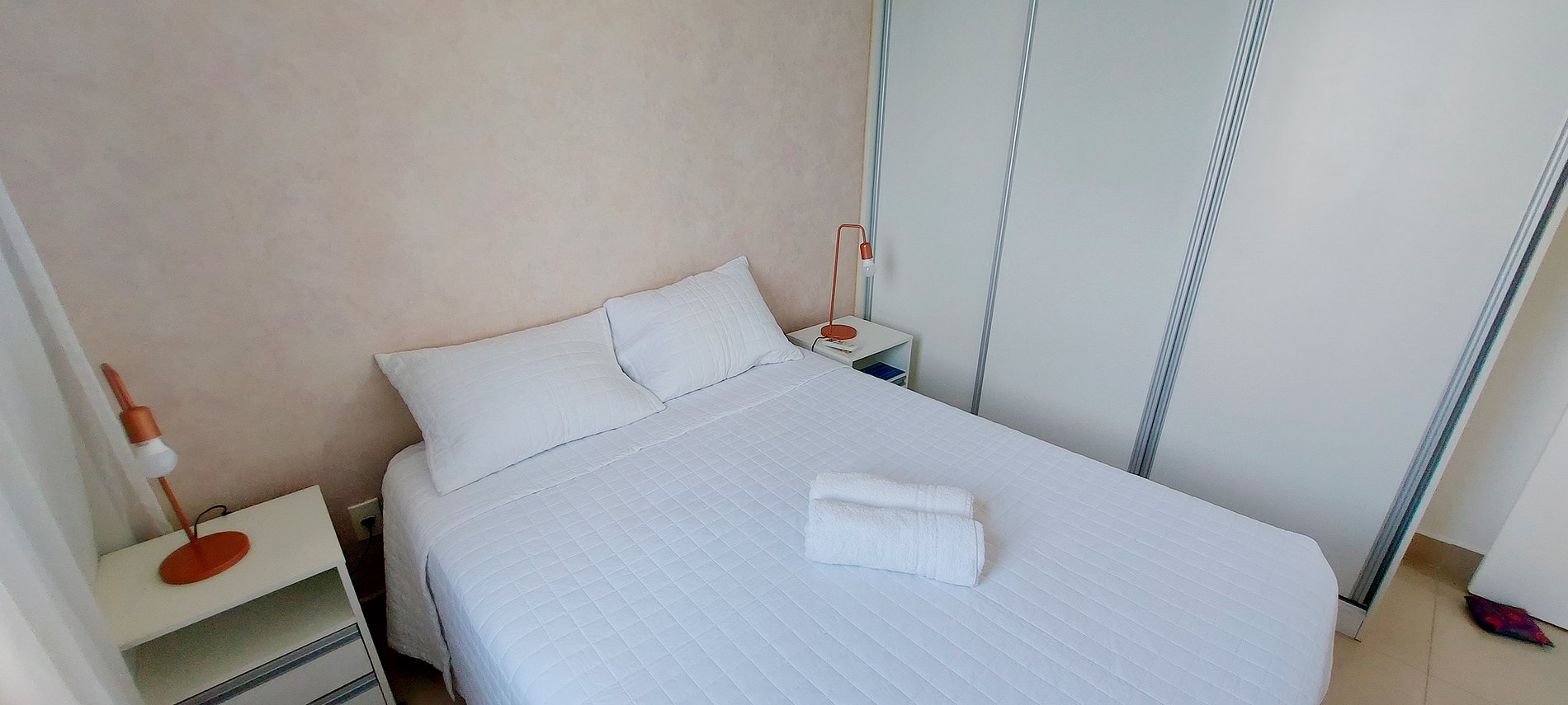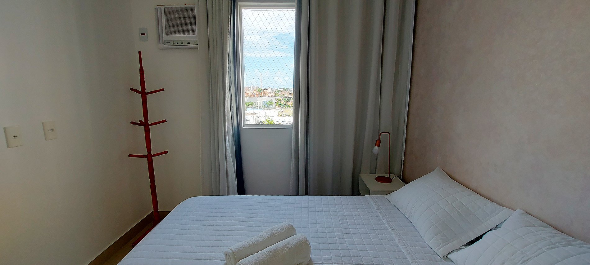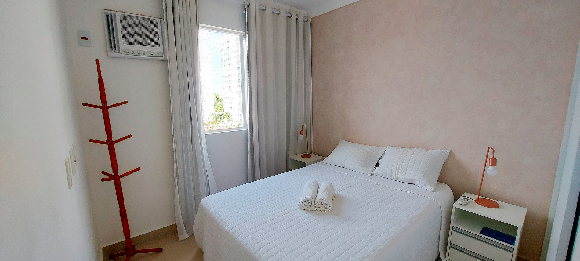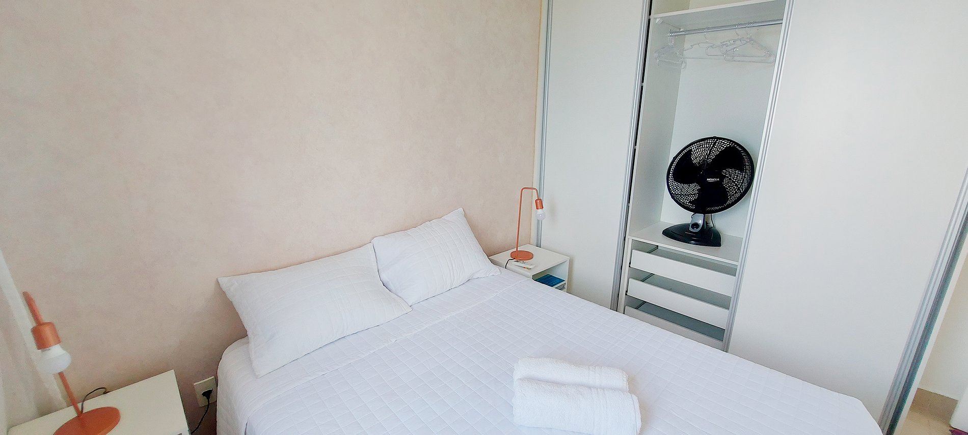 - Quarto com cama de casal com 2 mesinhas de cabeceira com abajur, guarda-roupa com espelho, ventilador de mesa, cabideiro, ar condicionado de janela, cortina blackout