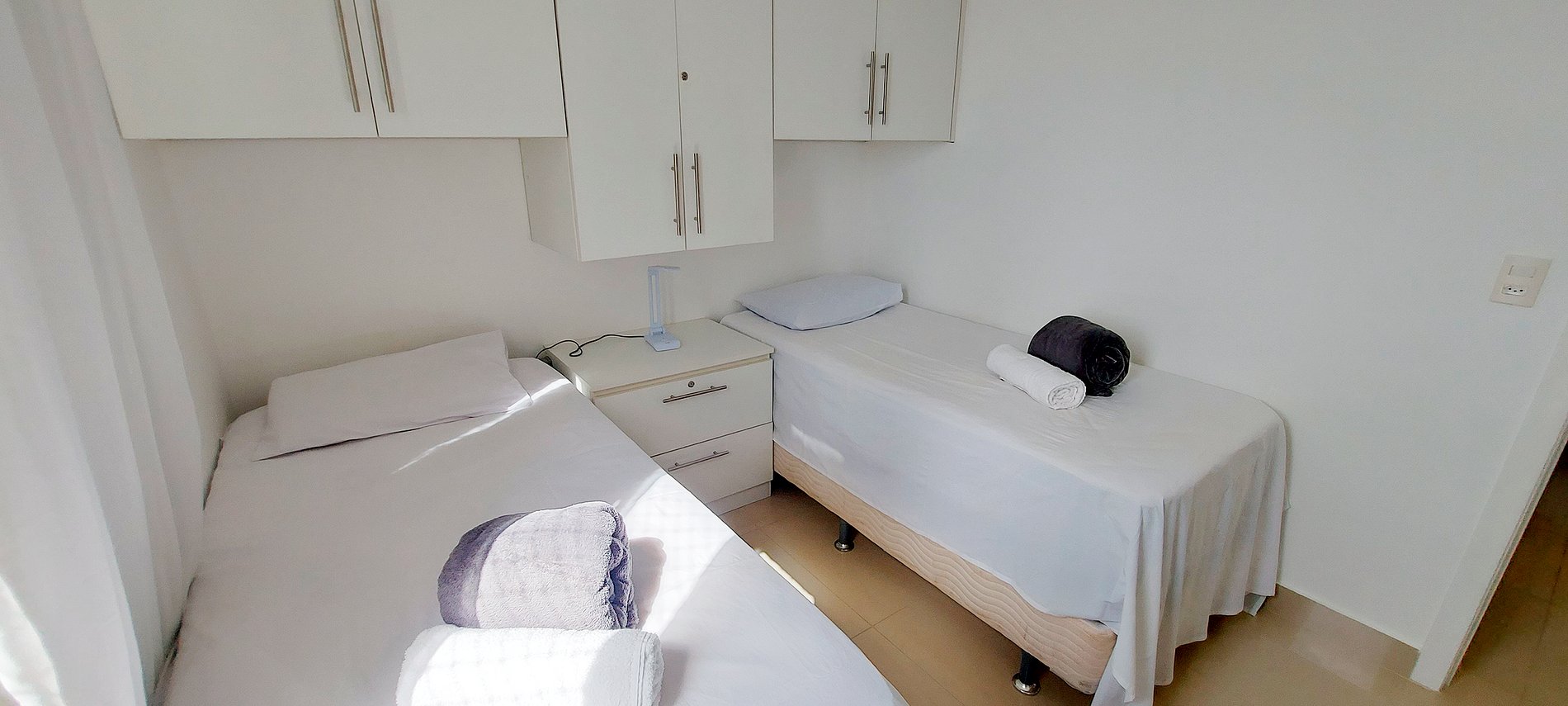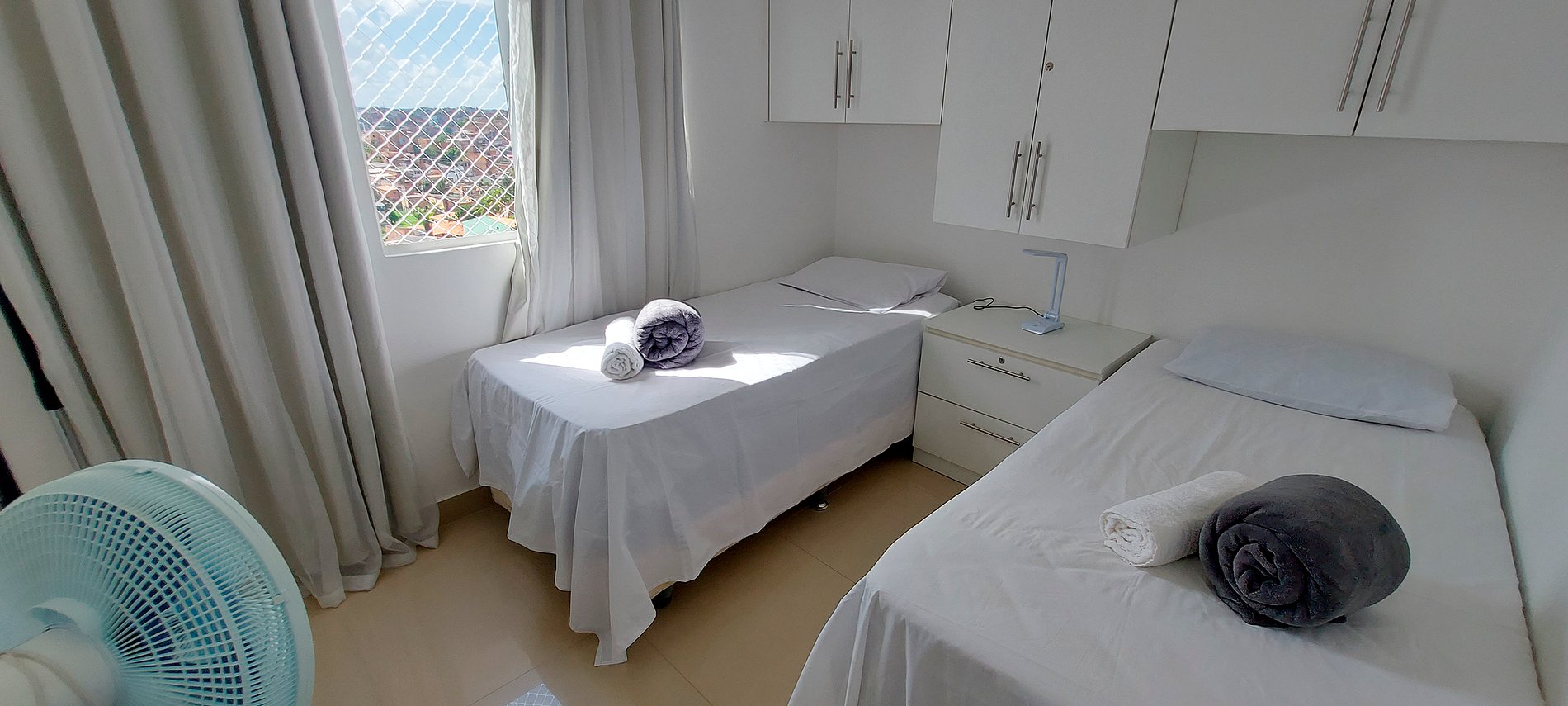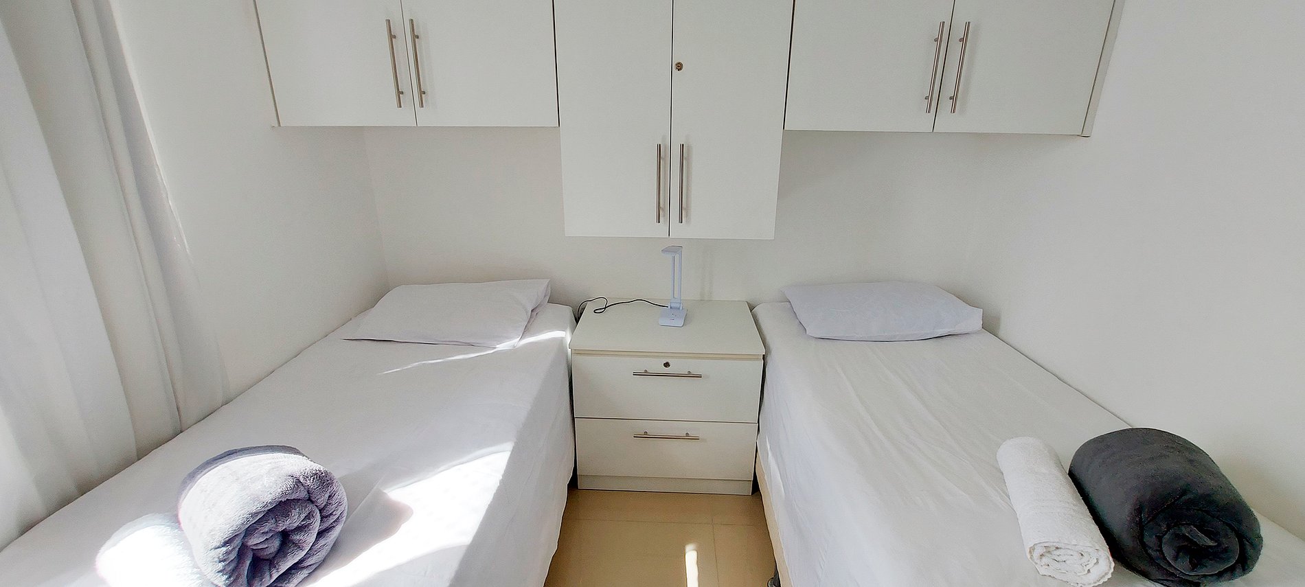 - Quarto com duas camas de solteiro, mesinha de cabeceira com abajur, ventilador de mesa, armários, cabideiro, ar condicionado split, cortina blackout, espelho