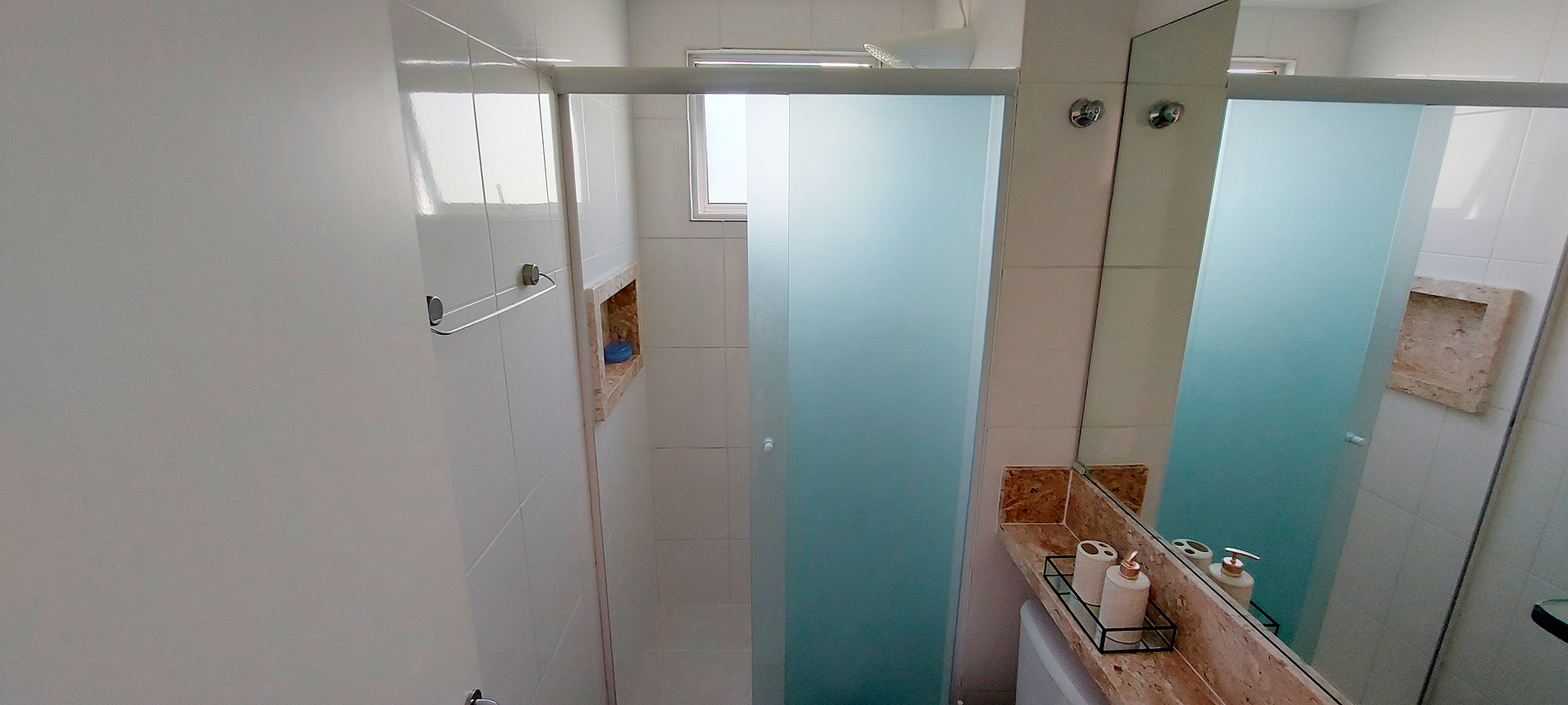 - Banheiro com espelho, box, chuveiro elétrico