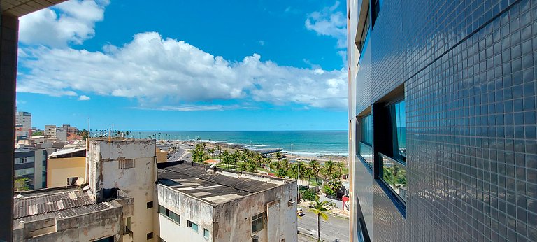 Quarto e sala com vista mar, novo e bem decorado no Costa Azul! Com cama casal, smart TV na sala e no quarto, ar condicionado split, sofá e cozinha completa. Condomínio com portaria 24hs, academia, piscina, co-working e lavanderia (paga à parte).
