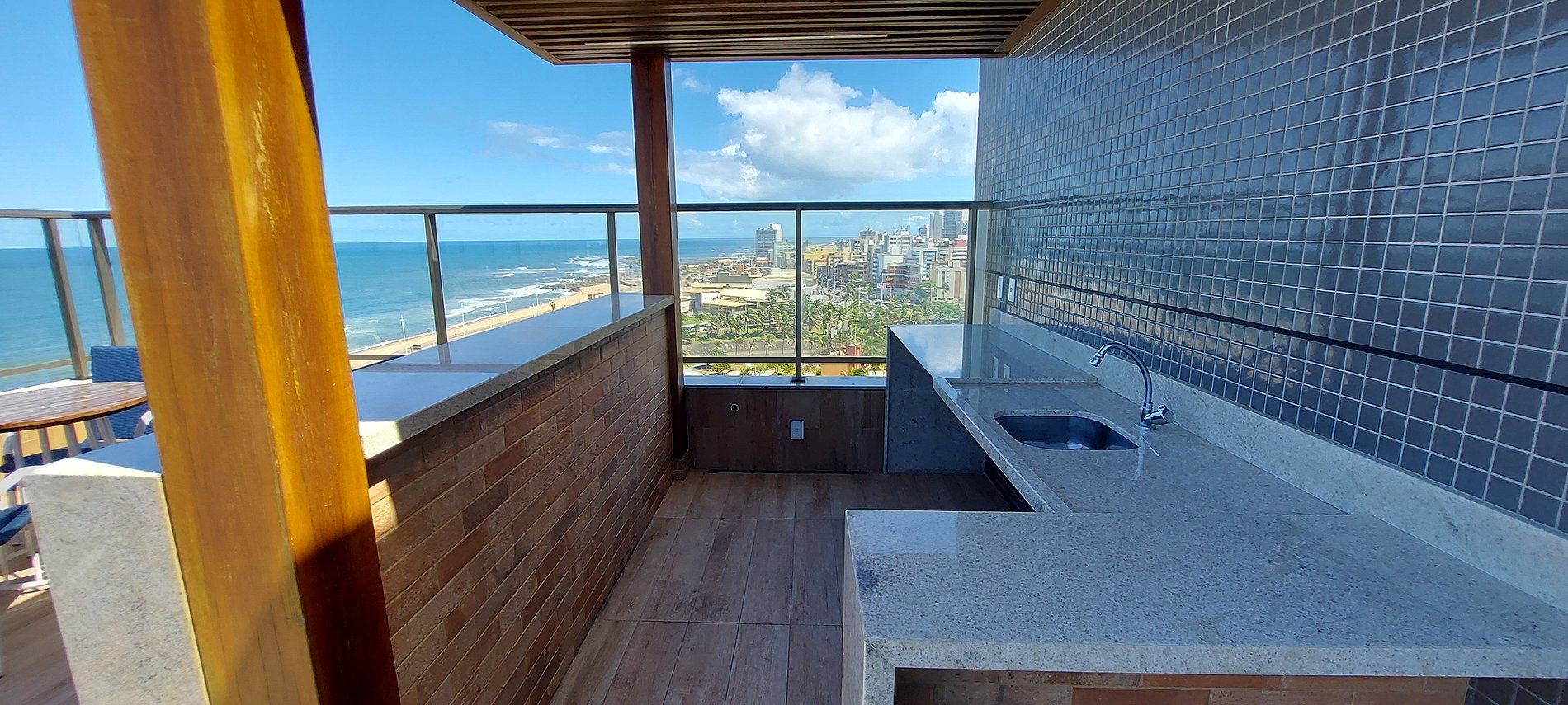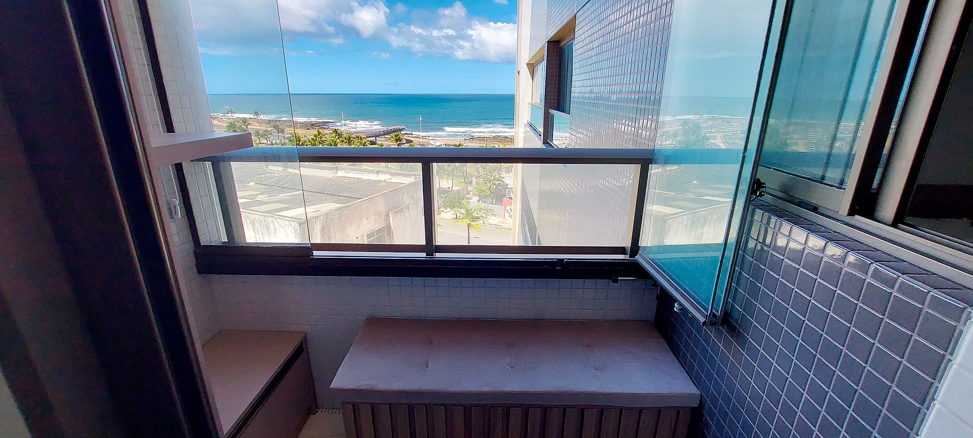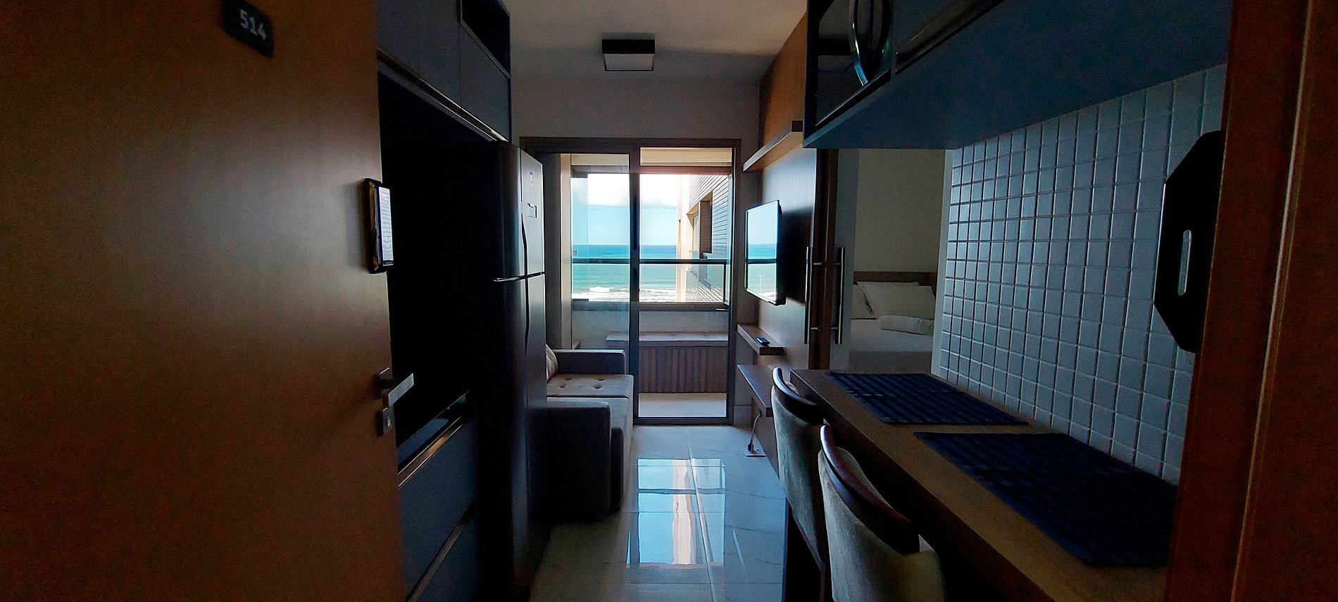 Quarto e sala com vista mar, novo e bem decorado no Costa Azul! Com cama casal, smart TV na sala e no quarto, ar condicionado split, sofá e cozinha completa. Condomínio com portaria 24hs, academia, piscina, co-working e lavanderia (paga à parte).