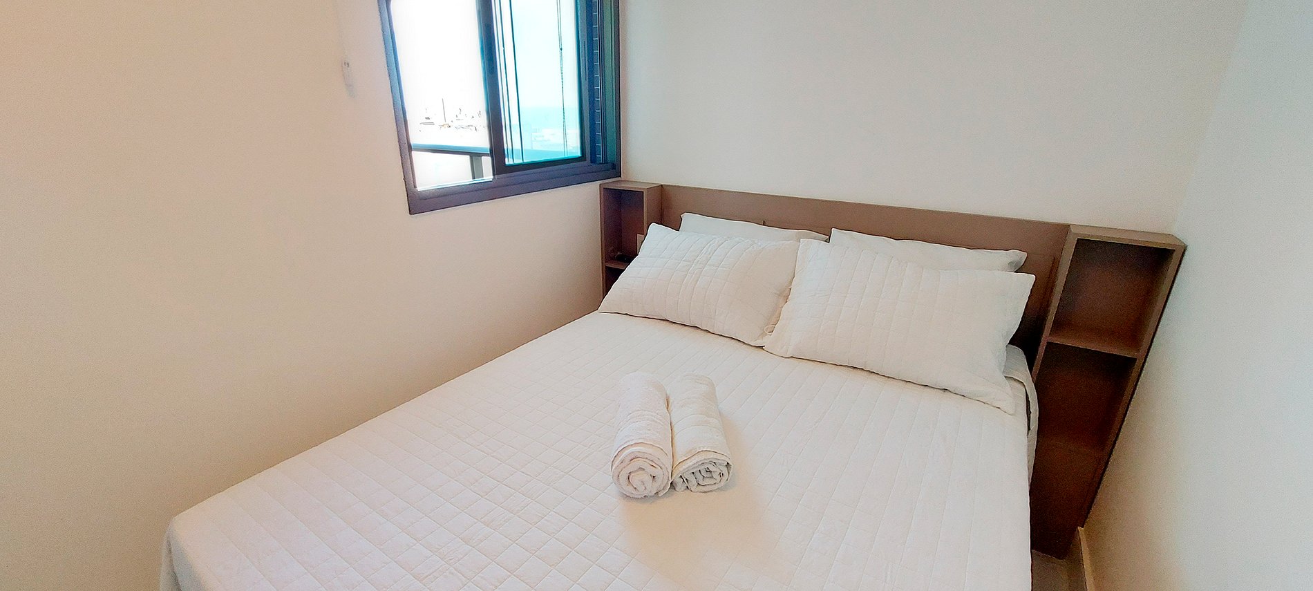 - Quarto com cama casal, cabeceira com mesinha de canto dos dois lados, ar condicionado split, smart TV, guarda-roupa, cortina com blackout