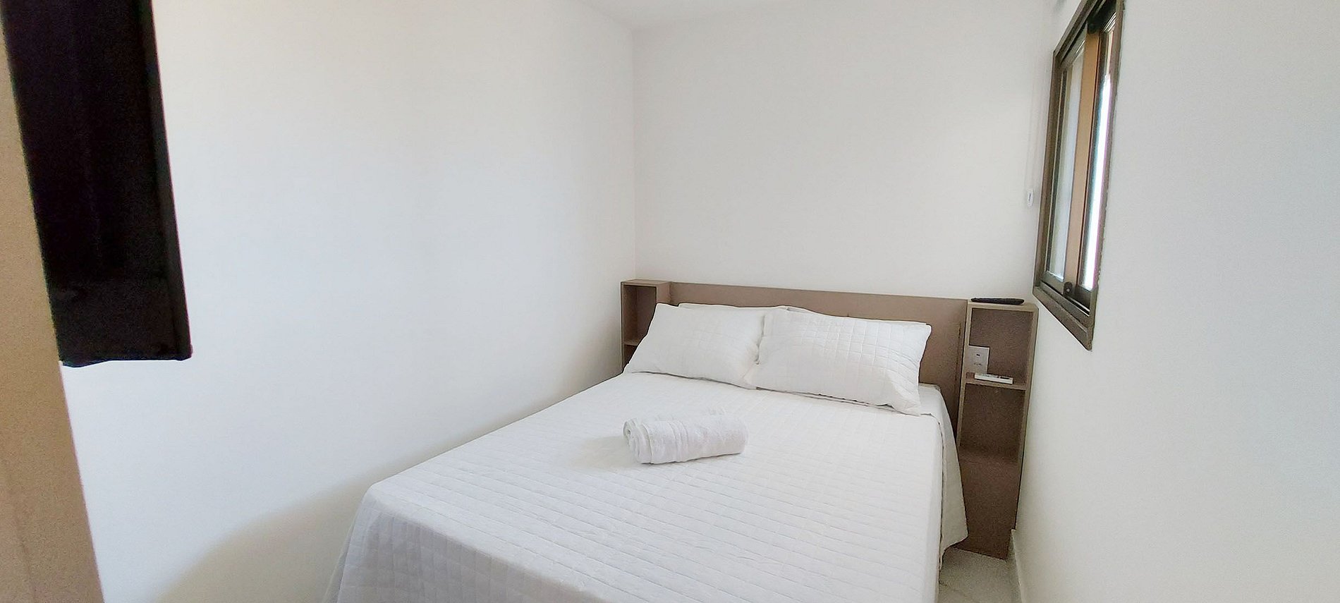 - Quarto com cama casal, cabeceira com mesinha de canto dos dois lados, ar condicionado split, smart TV, guarda-roupa, ferro de passar, cortina com blackout