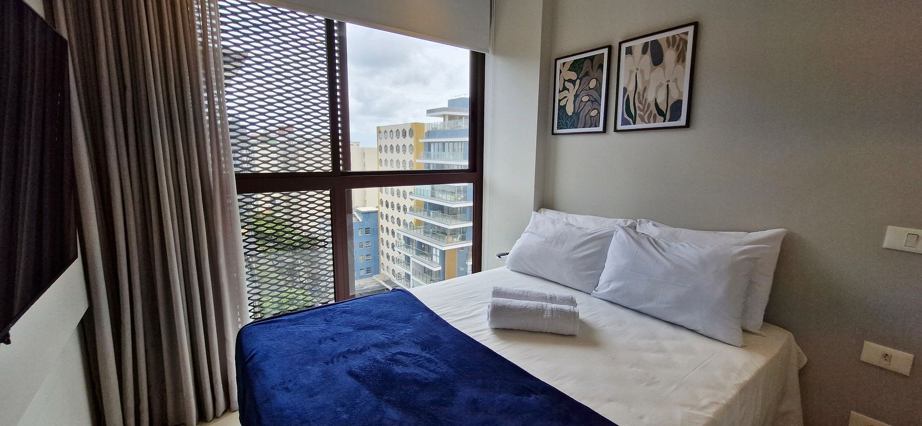 - SUÍTE: cama casal, guarda-roupa, smart TV (apps e LG Channels), ar condicionado split, janela com cortina blackout. BANHEIRO: armário, espelho, box, ducha higiênica e chuveiro elétrico.