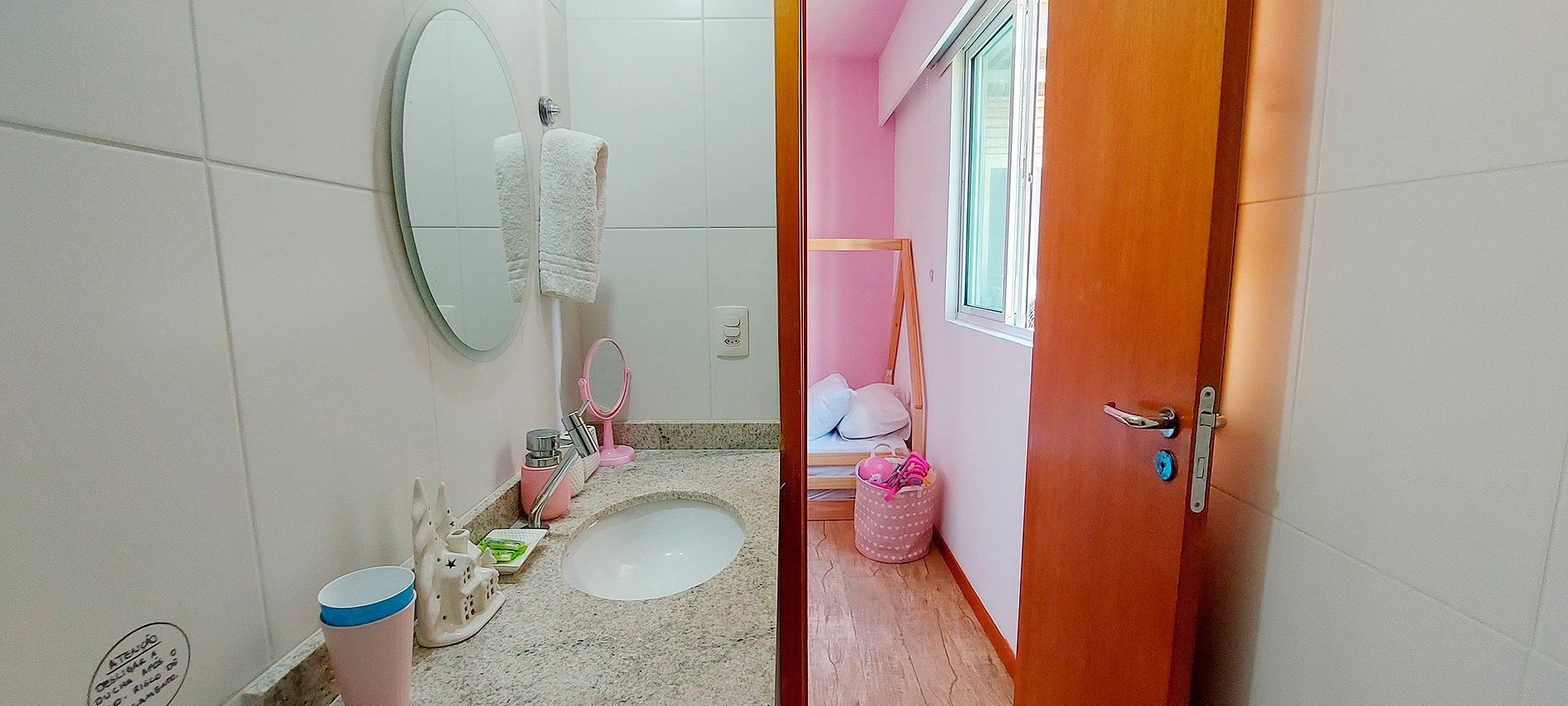 - SUITE 3: cama de solteiro infantil (estilo cabana), mesa infantil com 2 cadeirinhas, brinquedos e livros infantis, guarda-roupa, ar condicionado split, cortina blackout, banheiro com pia, espelho, box, banheira infantil, chuveiro climatizado